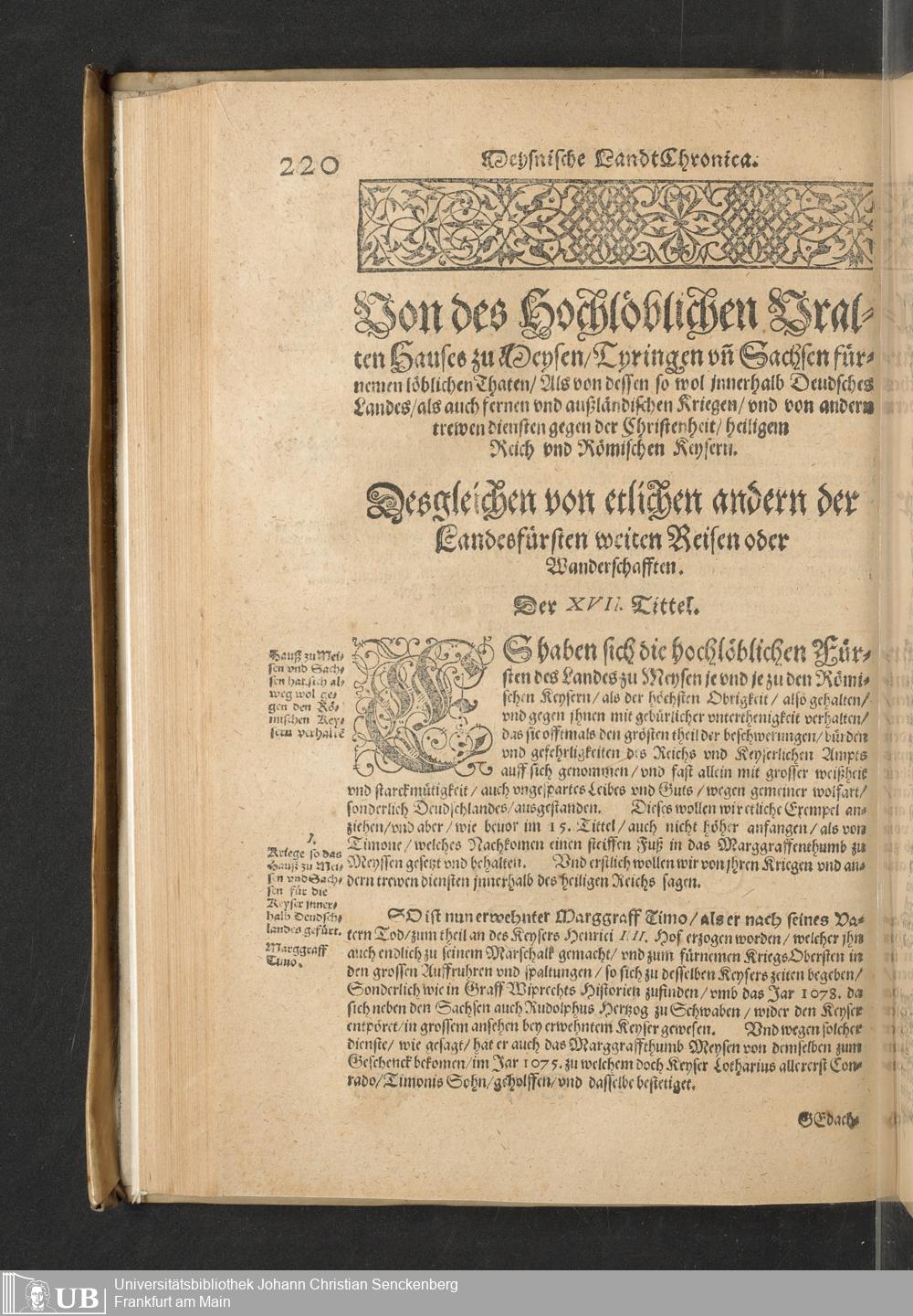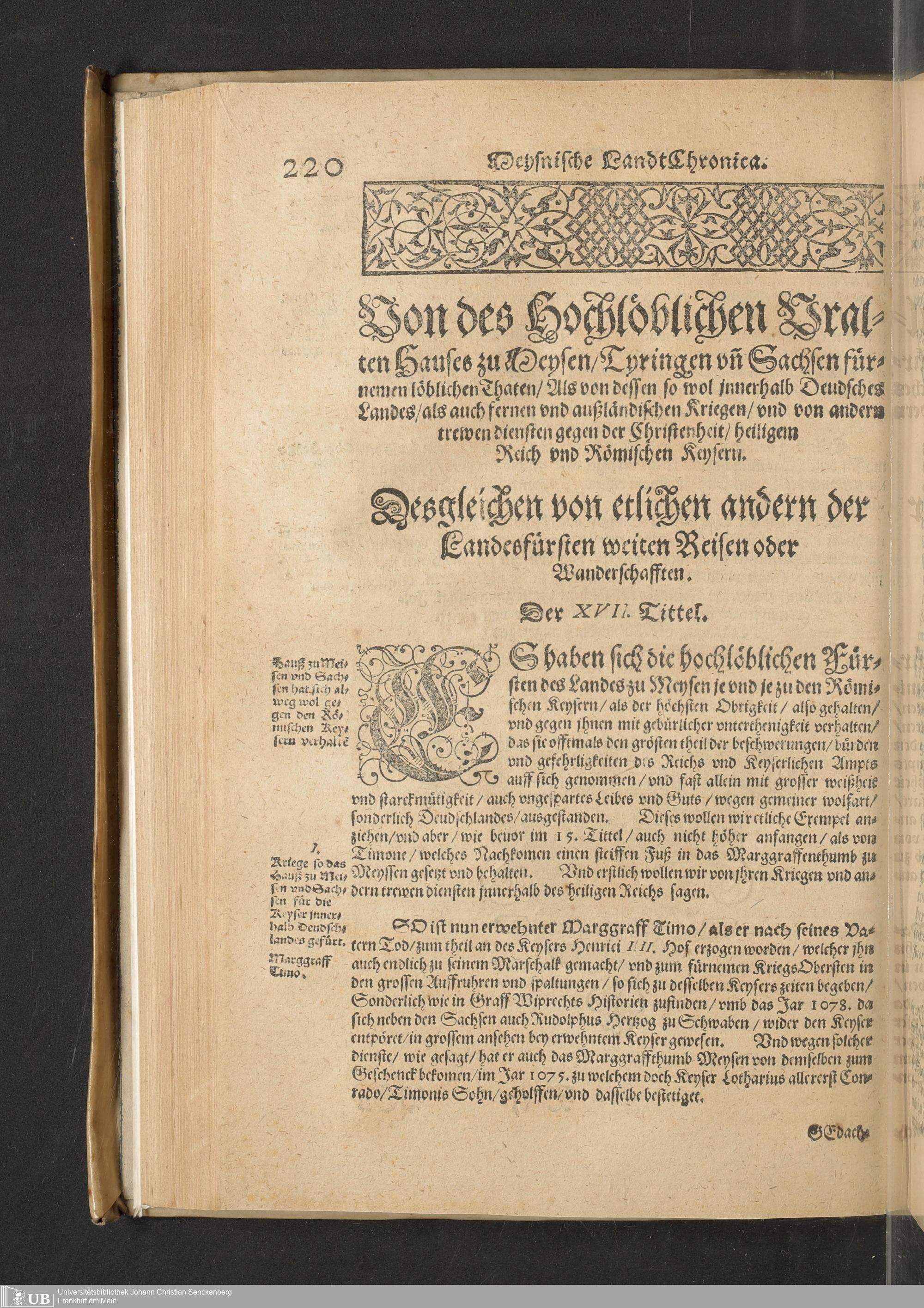 Meißnische Land vnd Berg-Chronica, : Jn welcher ein vollnstendige description des Landes, so zwischen der Elbe, Sala vnd Südödischen Behmischen gebirgen gelegen, So wol der dorinnen begriffenen auch anderer Bergwercken, sampt zugehörigen Metall vn[d] Metallar beschreibungen. : Mit einuorleibten fürnehmen Sächsischen, Düringischen vnd Meißninschen Historien. : Auch nicht wenig Tafeln, Wapen vnd Antiquiteten, derer etliche in Kupffer gestochen. / Gestellet durch Petrum Albinum M. Churf. Sech. Secr. ..