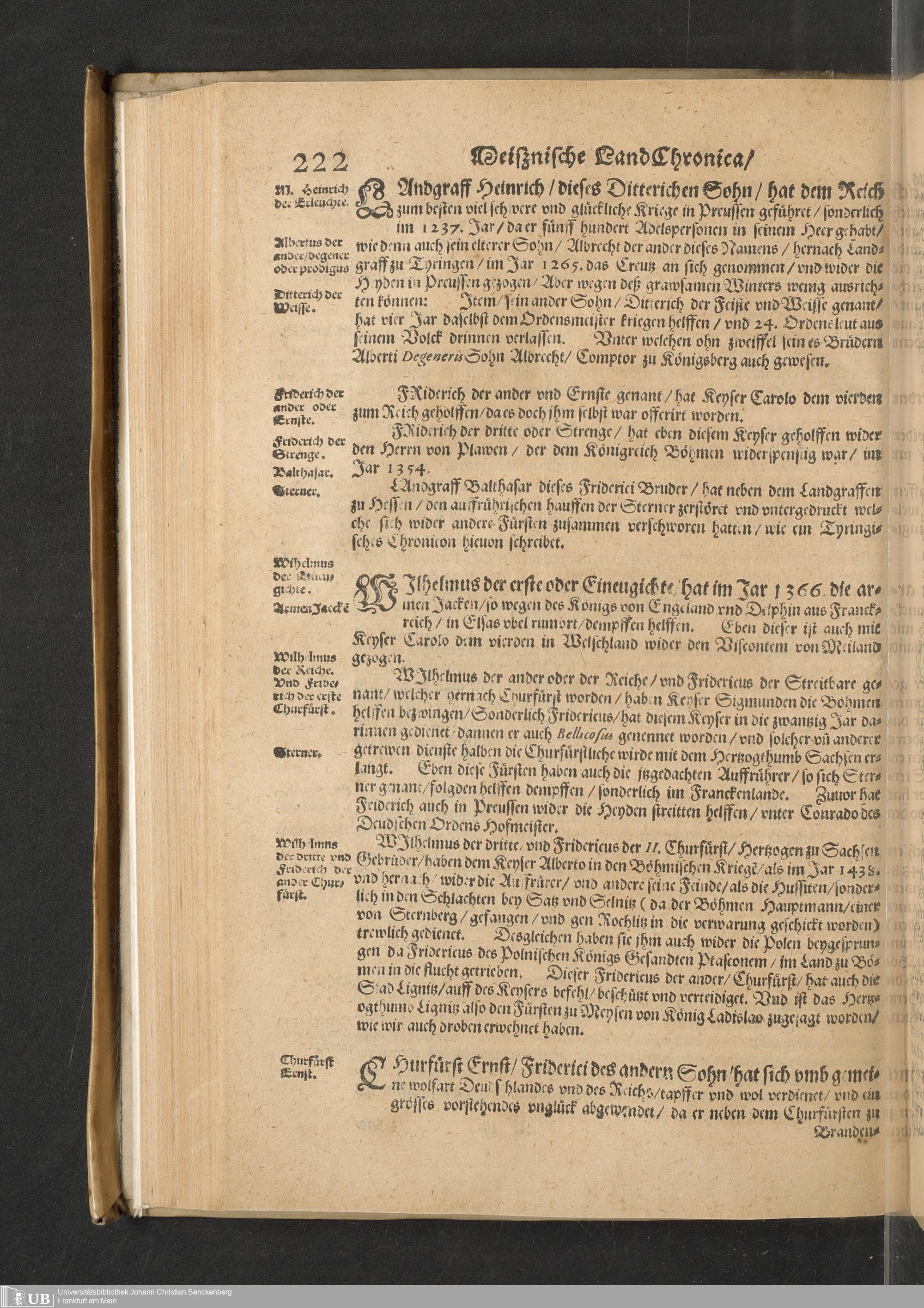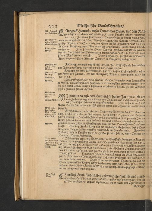 Meißnische Land vnd Berg-Chronica, : Jn welcher ein vollnstendige description des Landes, so zwischen der Elbe, Sala vnd Südödischen Behmischen gebirgen gelegen, So wol der dorinnen begriffenen auch anderer Bergwercken, sampt zugehörigen Metall vn[d] Metallar beschreibungen. : Mit einuorleibten fürnehmen Sächsischen, Düringischen vnd Meißninschen Historien. : Auch nicht wenig Tafeln, Wapen vnd Antiquiteten, derer etliche in Kupffer gestochen. / Gestellet durch Petrum Albinum M. Churf. Sech. Secr. ..