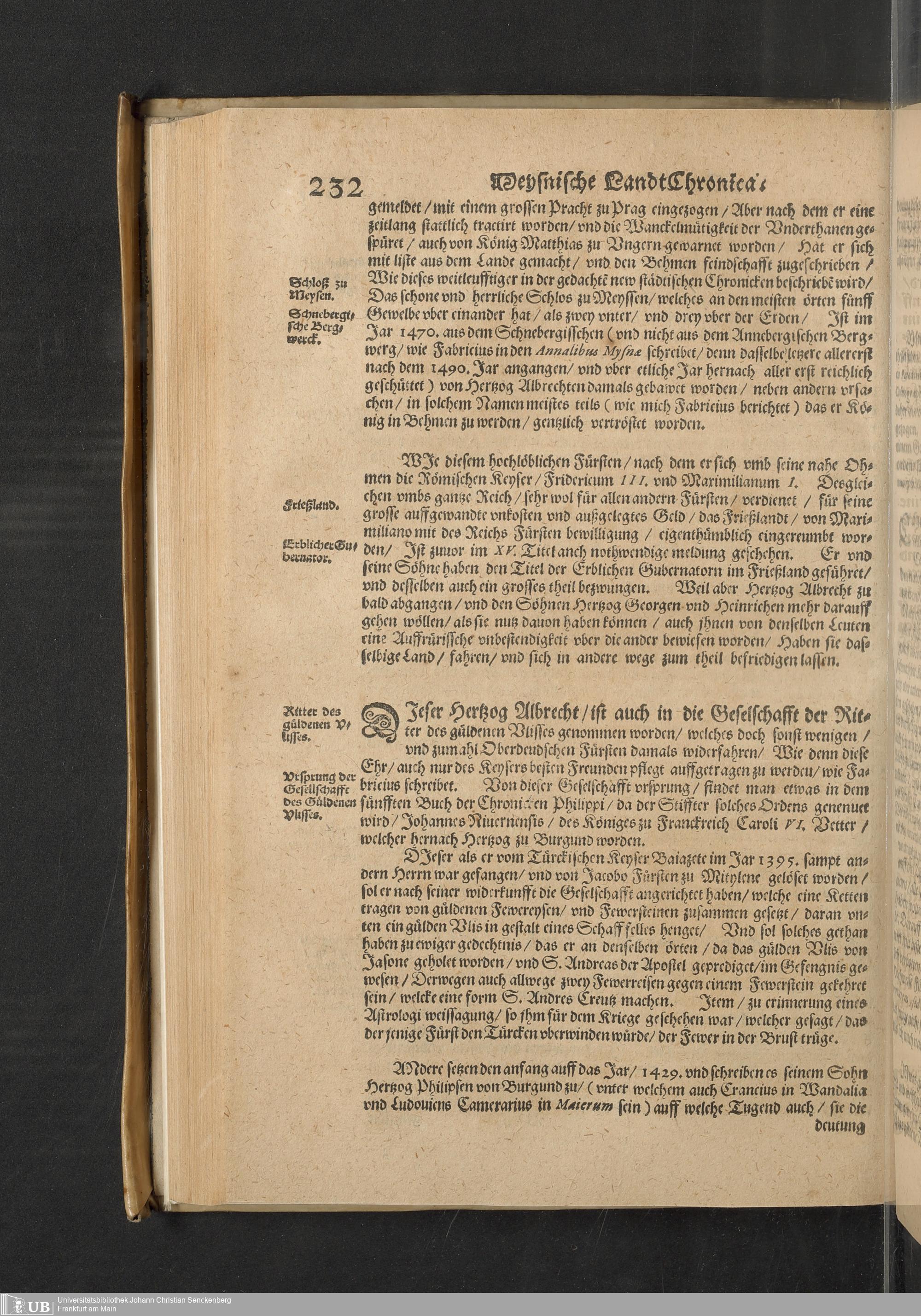 Meißnische Land vnd Berg-Chronica, : Jn welcher ein vollnstendige description des Landes, so zwischen der Elbe, Sala vnd Südödischen Behmischen gebirgen gelegen, So wol der dorinnen begriffenen auch anderer Bergwercken, sampt zugehörigen Metall vn[d] Metallar beschreibungen. : Mit einuorleibten fürnehmen Sächsischen, Düringischen vnd Meißninschen Historien. : Auch nicht wenig Tafeln, Wapen vnd Antiquiteten, derer etliche in Kupffer gestochen. / Gestellet durch Petrum Albinum M. Churf. Sech. Secr. ..