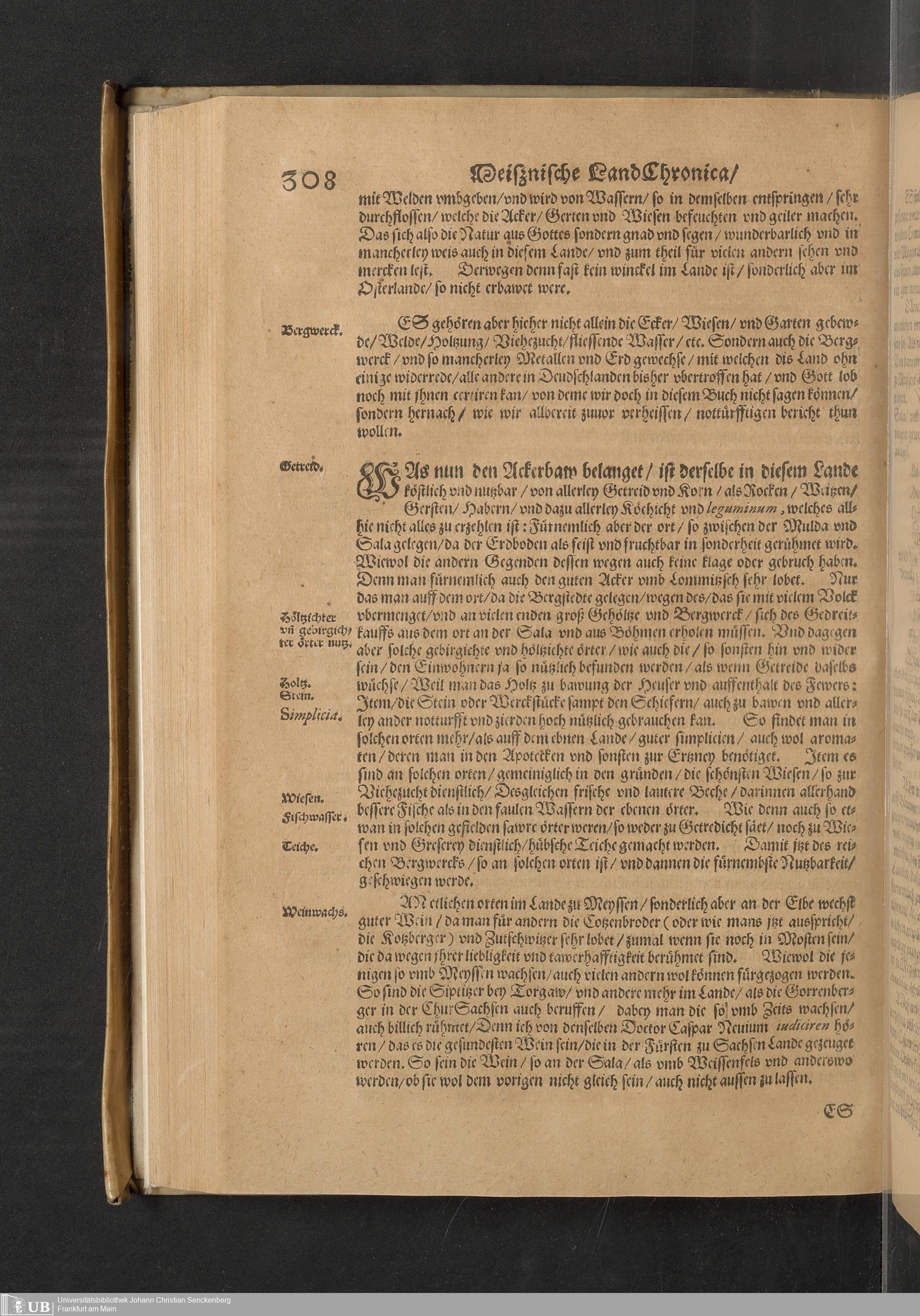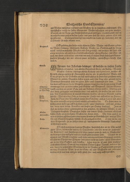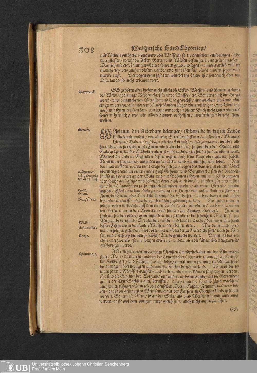 Meißnische Land vnd Berg-Chronica, : Jn welcher ein vollnstendige description des Landes, so zwischen der Elbe, Sala vnd Südödischen Behmischen gebirgen gelegen, So wol der dorinnen begriffenen auch anderer Bergwercken, sampt zugehörigen Metall vn[d] Metallar beschreibungen. : Mit einuorleibten fürnehmen Sächsischen, Düringischen vnd Meißninschen Historien. : Auch nicht wenig Tafeln, Wapen vnd Antiquiteten, derer etliche in Kupffer gestochen. / Gestellet durch Petrum Albinum M. Churf. Sech. Secr. ..