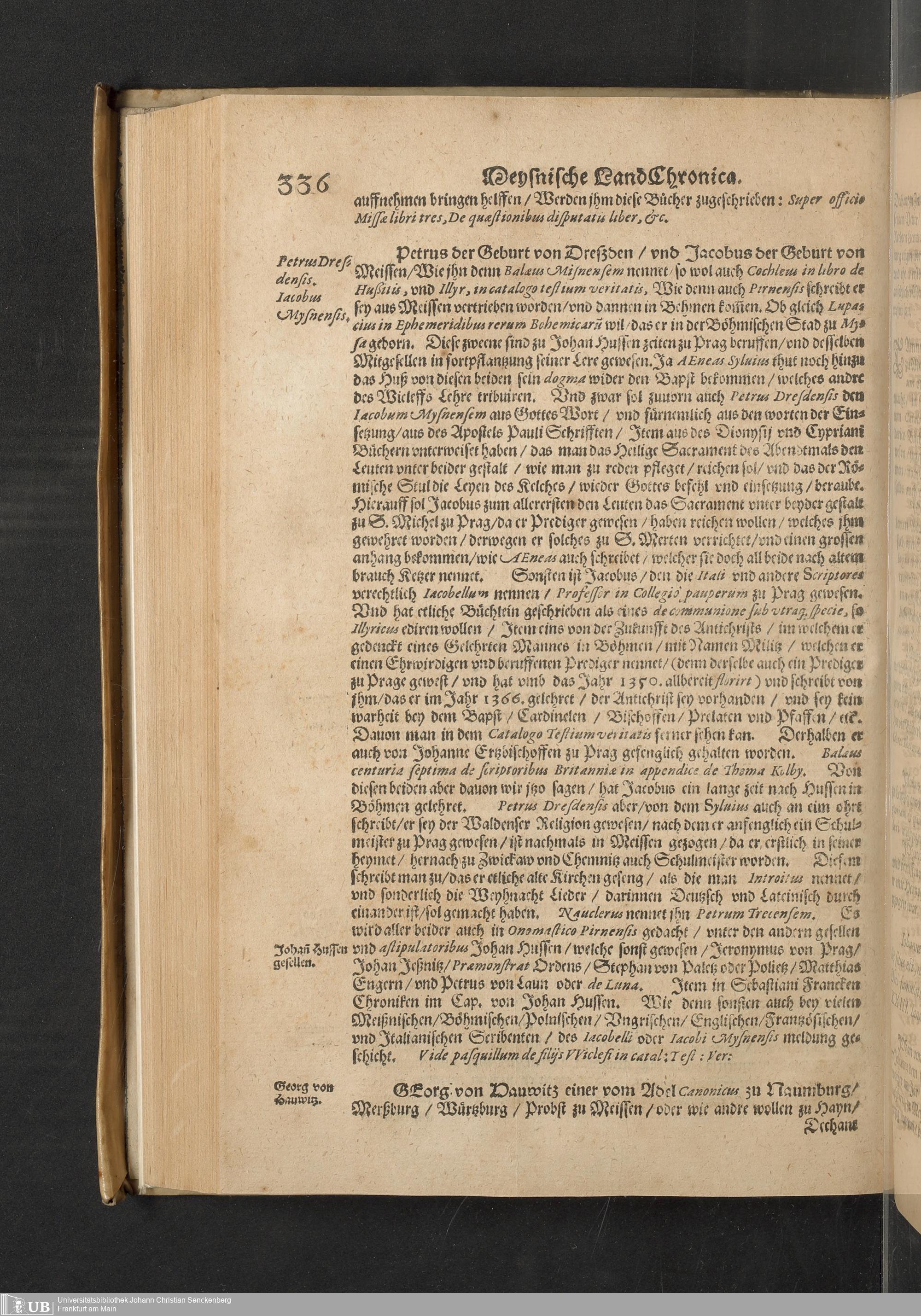 Meißnische Land vnd Berg-Chronica, : Jn welcher ein vollnstendige description des Landes, so zwischen der Elbe, Sala vnd Südödischen Behmischen gebirgen gelegen, So wol der dorinnen begriffenen auch anderer Bergwercken, sampt zugehörigen Metall vn[d] Metallar beschreibungen. : Mit einuorleibten fürnehmen Sächsischen, Düringischen vnd Meißninschen Historien. : Auch nicht wenig Tafeln, Wapen vnd Antiquiteten, derer etliche in Kupffer gestochen. / Gestellet durch Petrum Albinum M. Churf. Sech. Secr. ..