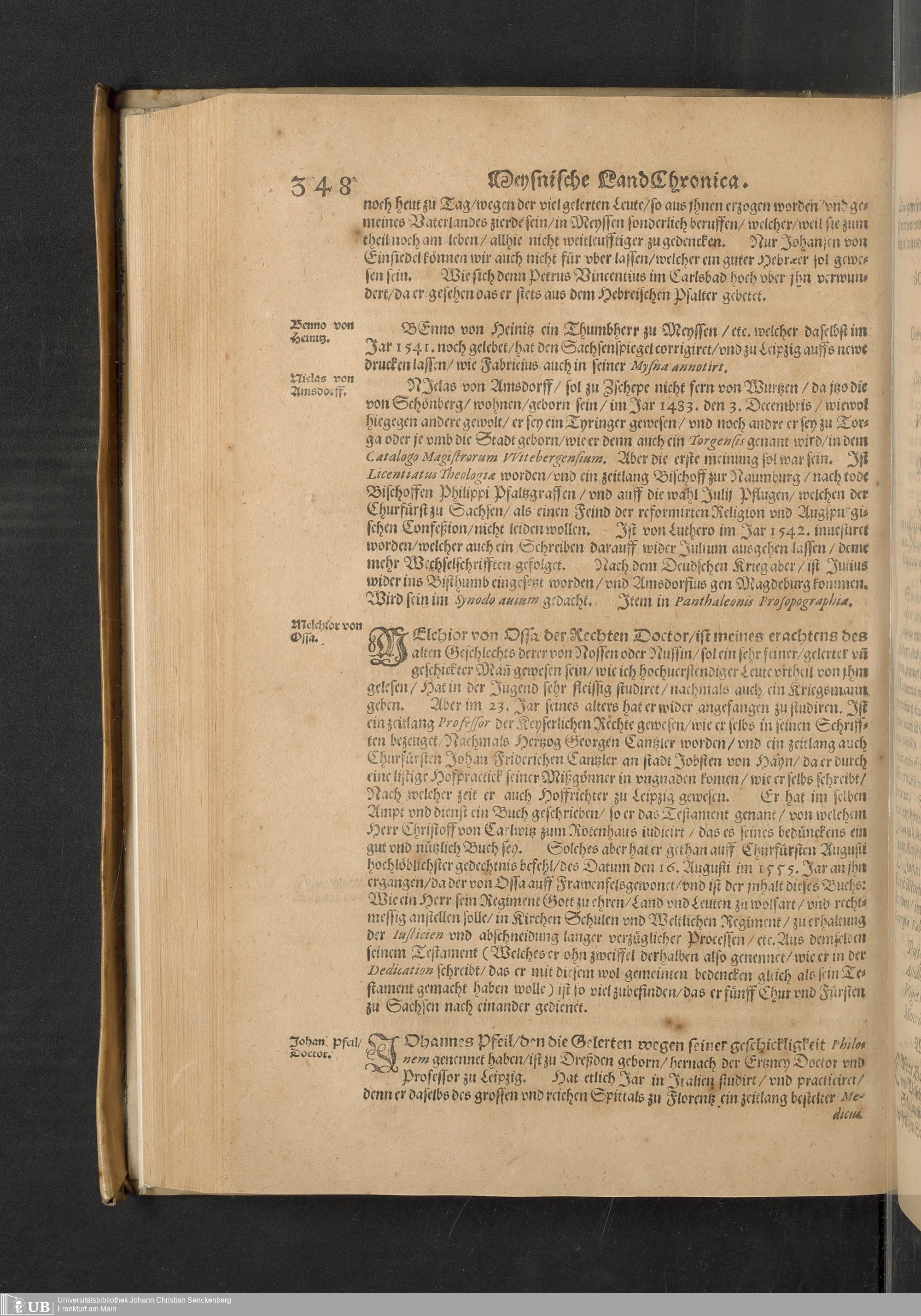 Meißnische Land vnd Berg-Chronica, : Jn welcher ein vollnstendige description des Landes, so zwischen der Elbe, Sala vnd Südödischen Behmischen gebirgen gelegen, So wol der dorinnen begriffenen auch anderer Bergwercken, sampt zugehörigen Metall vn[d] Metallar beschreibungen. : Mit einuorleibten fürnehmen Sächsischen, Düringischen vnd Meißninschen Historien. : Auch nicht wenig Tafeln, Wapen vnd Antiquiteten, derer etliche in Kupffer gestochen. / Gestellet durch Petrum Albinum M. Churf. Sech. Secr. ..