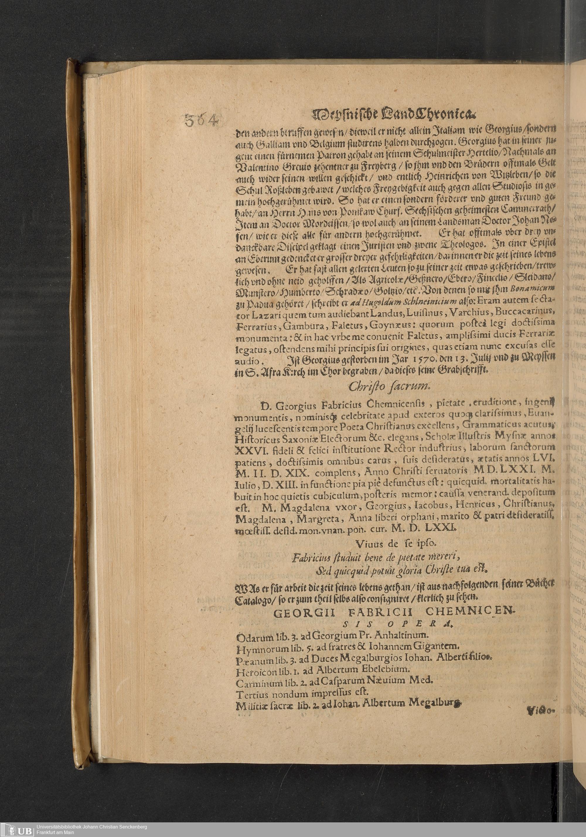 Meißnische Land vnd Berg-Chronica, : Jn welcher ein vollnstendige description des Landes, so zwischen der Elbe, Sala vnd Südödischen Behmischen gebirgen gelegen, So wol der dorinnen begriffenen auch anderer Bergwercken, sampt zugehörigen Metall vn[d] Metallar beschreibungen. : Mit einuorleibten fürnehmen Sächsischen, Düringischen vnd Meißninschen Historien. : Auch nicht wenig Tafeln, Wapen vnd Antiquiteten, derer etliche in Kupffer gestochen. / Gestellet durch Petrum Albinum M. Churf. Sech. Secr. ..