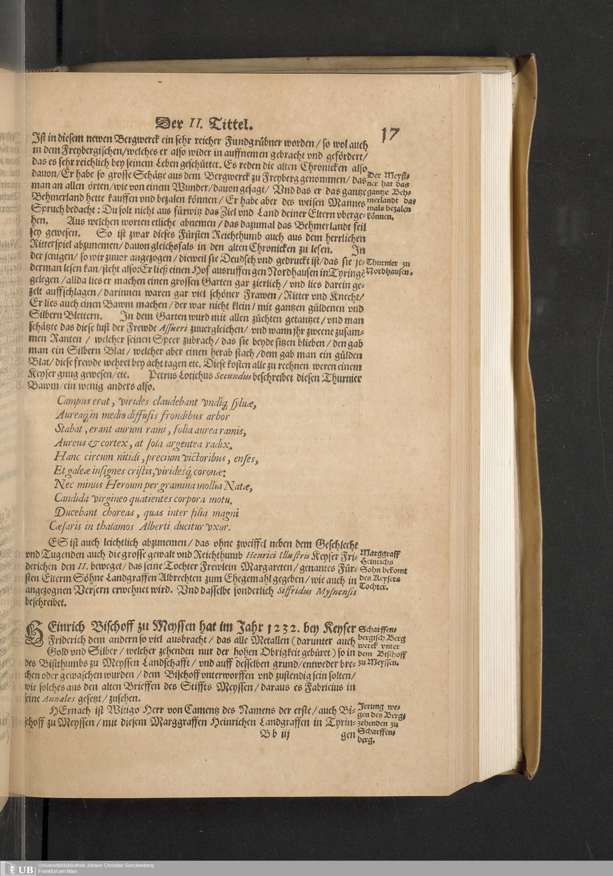 Meißnische Land vnd Berg-Chronica, : Jn welcher ein vollnstendige description des Landes, so zwischen der Elbe, Sala vnd Südödischen Behmischen gebirgen gelegen, So wol der dorinnen begriffenen auch anderer Bergwercken, sampt zugehörigen Metall vn[d] Metallar beschreibungen. : Mit einuorleibten fürnehmen Sächsischen, Düringischen vnd Meißninschen Historien. : Auch nicht wenig Tafeln, Wapen vnd Antiquiteten, derer etliche in Kupffer gestochen. / Gestellet durch Petrum Albinum M. Churf. Sech. Secr. ..