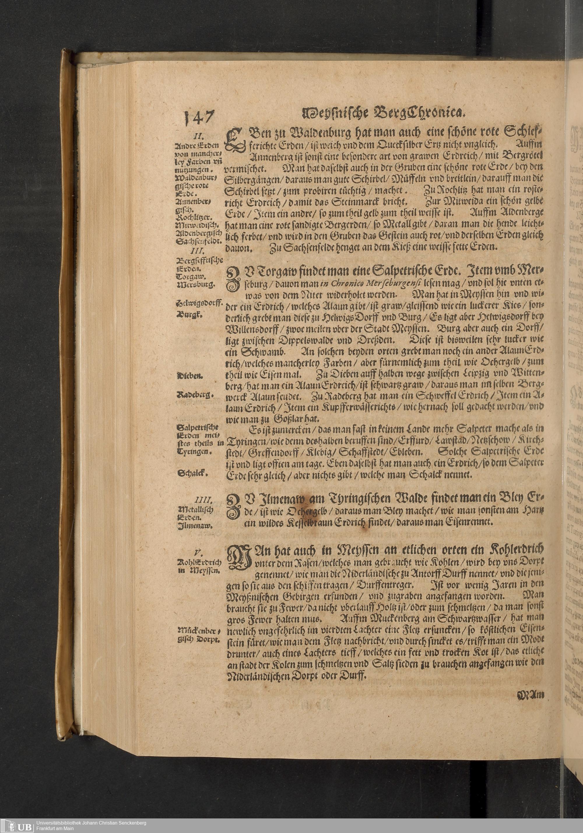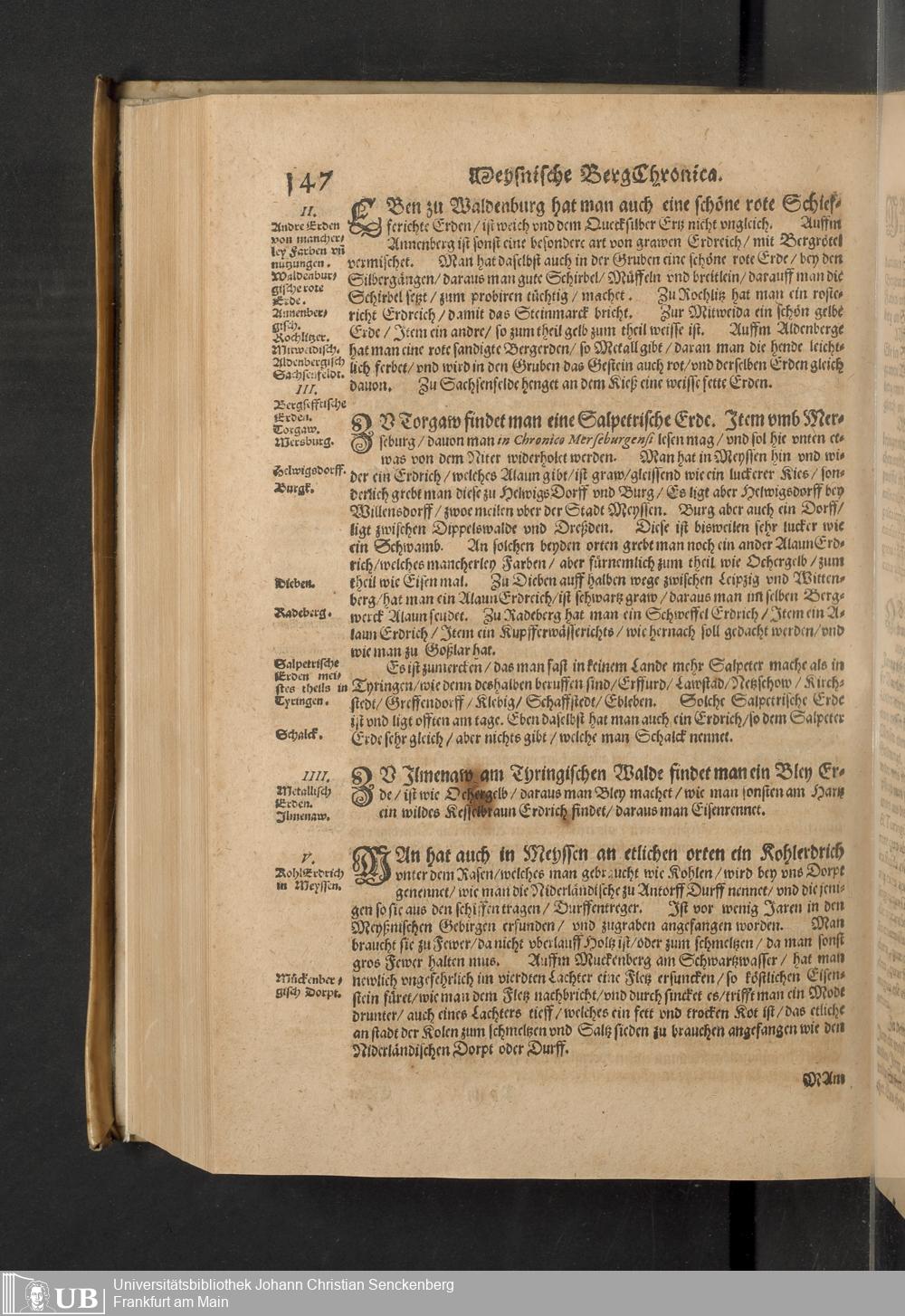 Meißnische Land vnd Berg-Chronica, : Jn welcher ein vollnstendige description des Landes, so zwischen der Elbe, Sala vnd Südödischen Behmischen gebirgen gelegen, So wol der dorinnen begriffenen auch anderer Bergwercken, sampt zugehörigen Metall vn[d] Metallar beschreibungen. : Mit einuorleibten fürnehmen Sächsischen, Düringischen vnd Meißninschen Historien. : Auch nicht wenig Tafeln, Wapen vnd Antiquiteten, derer etliche in Kupffer gestochen. / Gestellet durch Petrum Albinum M. Churf. Sech. Secr. ..