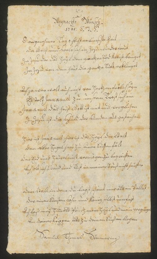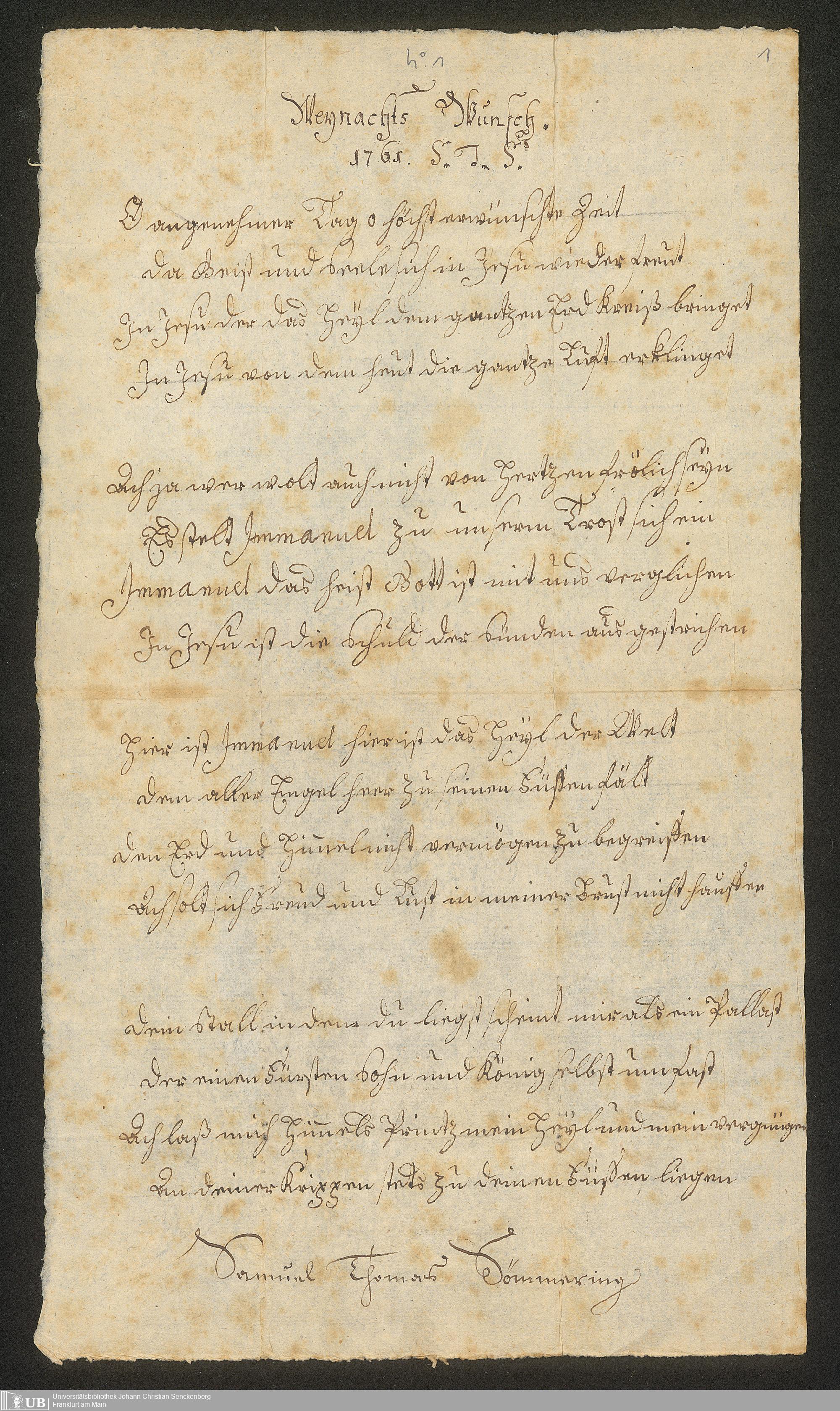 Ms. Ff. S. Th. v. Soemmerring 7 B - 43 Neujahrs-, Weihnachts-, Geburtstags- und Namenstagsgratulationen in Versen und in Prosa an beide Eltern, besonders an den Vater gerichtet. 1 Neujahrsschreiben der Mutter.