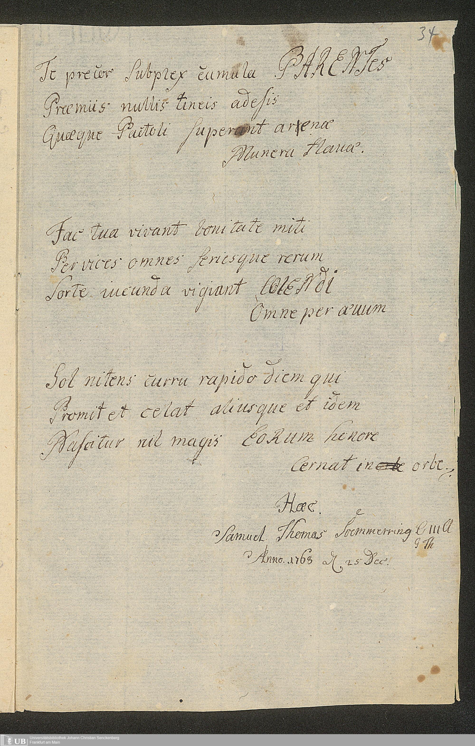 Ms. Ff. S. Th. v. Soemmerring 7 B - 43 Neujahrs-, Weihnachts-, Geburtstags- und Namenstagsgratulationen in Versen und in Prosa an beide Eltern, besonders an den Vater gerichtet. 1 Neujahrsschreiben der Mutter.