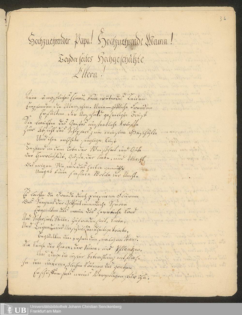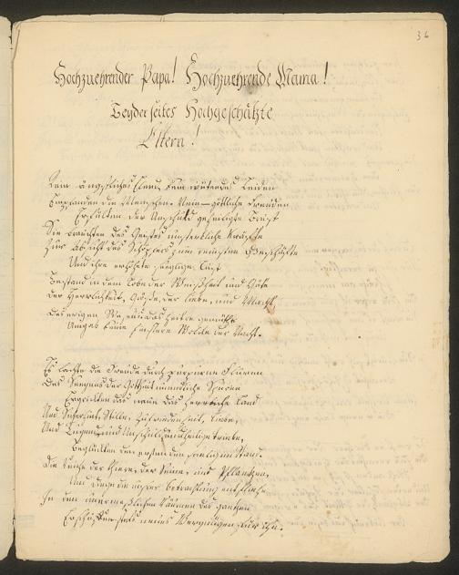 Ms. Ff. S. Th. v. Soemmerring 7 B - 43 Neujahrs-, Weihnachts-, Geburtstags- und Namenstagsgratulationen in Versen und in Prosa an beide Eltern, besonders an den Vater gerichtet. 1 Neujahrsschreiben der Mutter.