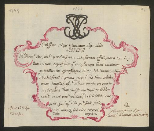 Ms. Ff. S. Th. v. Soemmerring 7 B - 43 Neujahrs-, Weihnachts-, Geburtstags- und Namenstagsgratulationen in Versen und in Prosa an beide Eltern, besonders an den Vater gerichtet. 1 Neujahrsschreiben der Mutter.