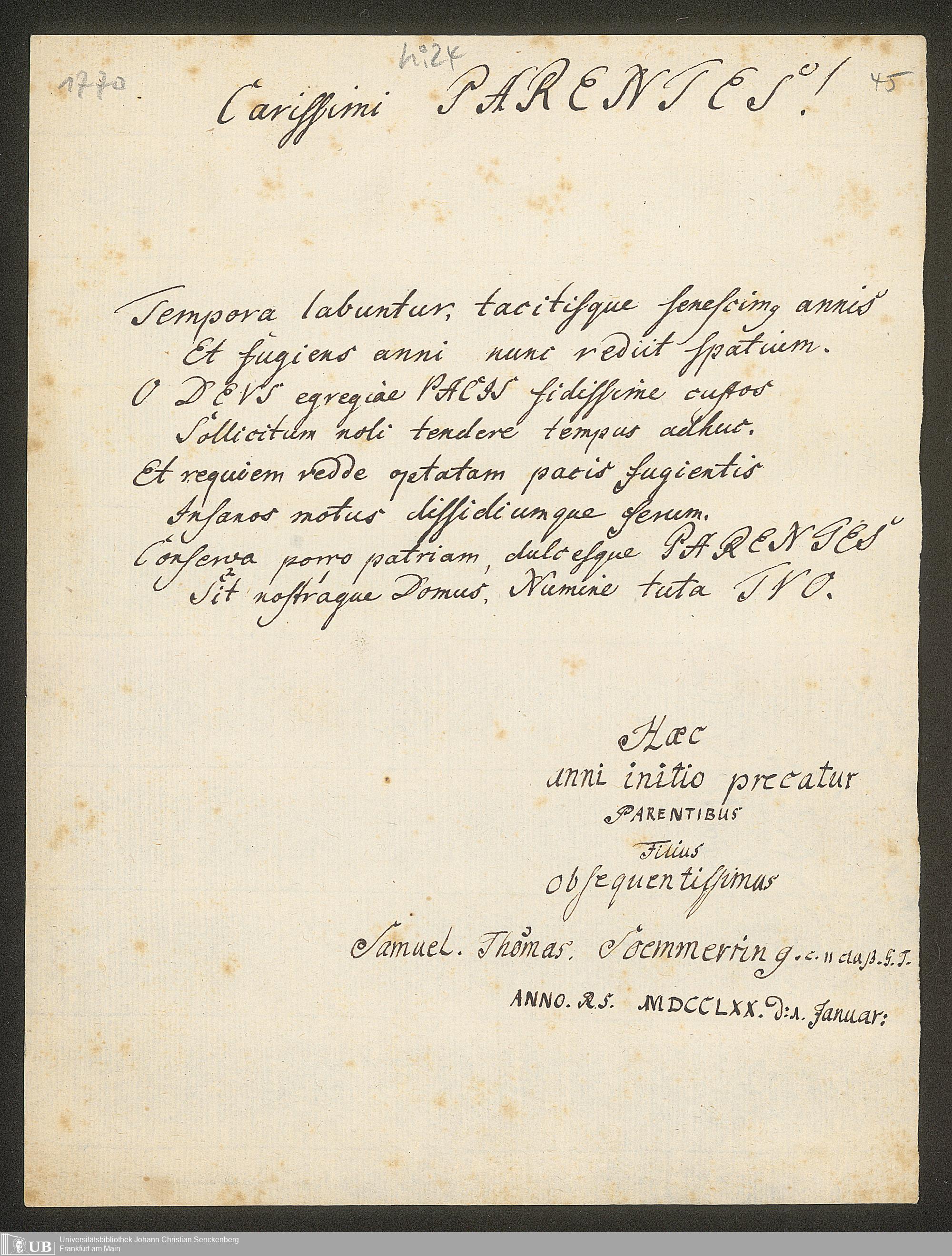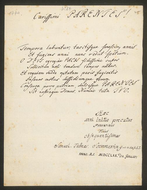 Ms. Ff. S. Th. v. Soemmerring 7 B - 43 Neujahrs-, Weihnachts-, Geburtstags- und Namenstagsgratulationen in Versen und in Prosa an beide Eltern, besonders an den Vater gerichtet. 1 Neujahrsschreiben der Mutter.