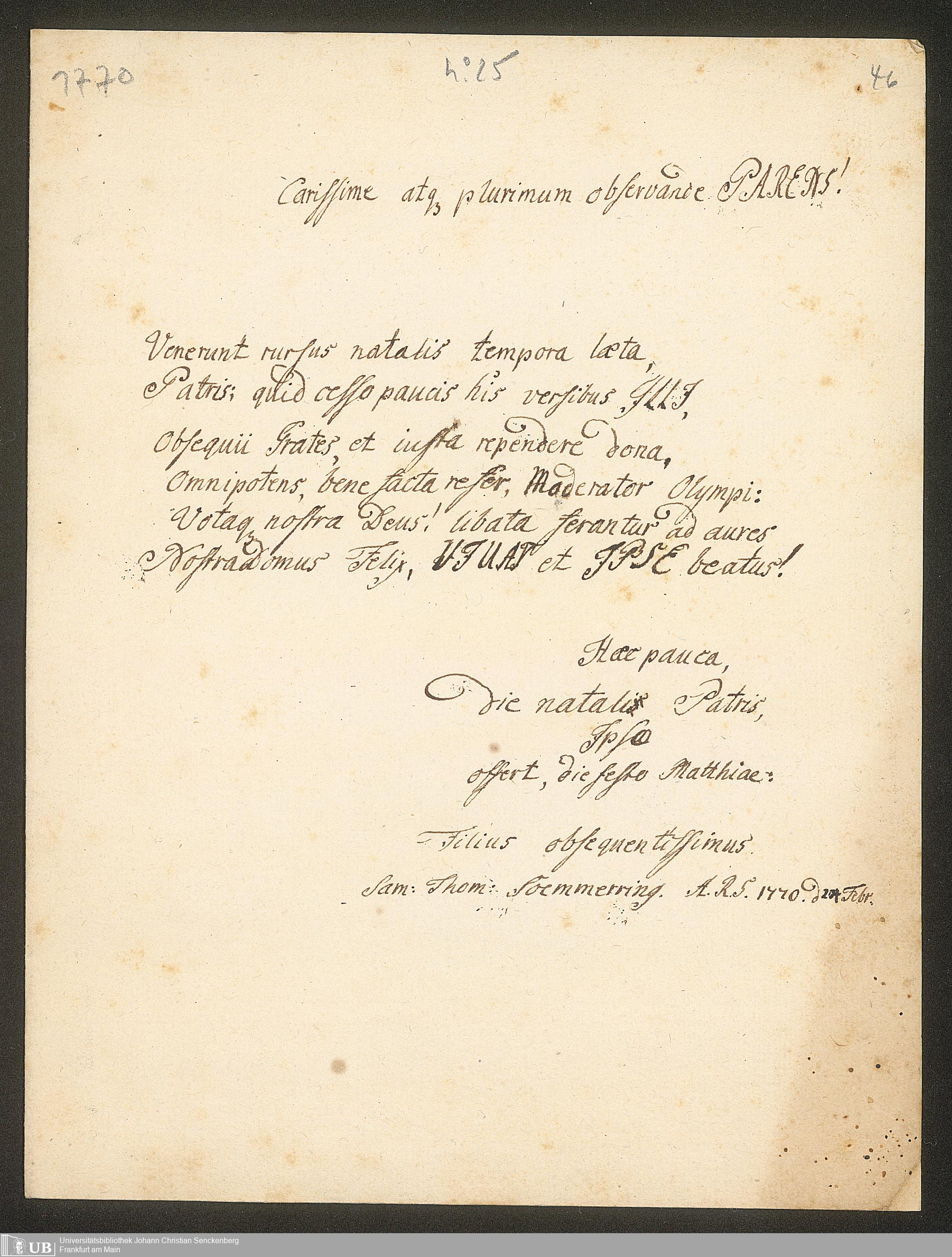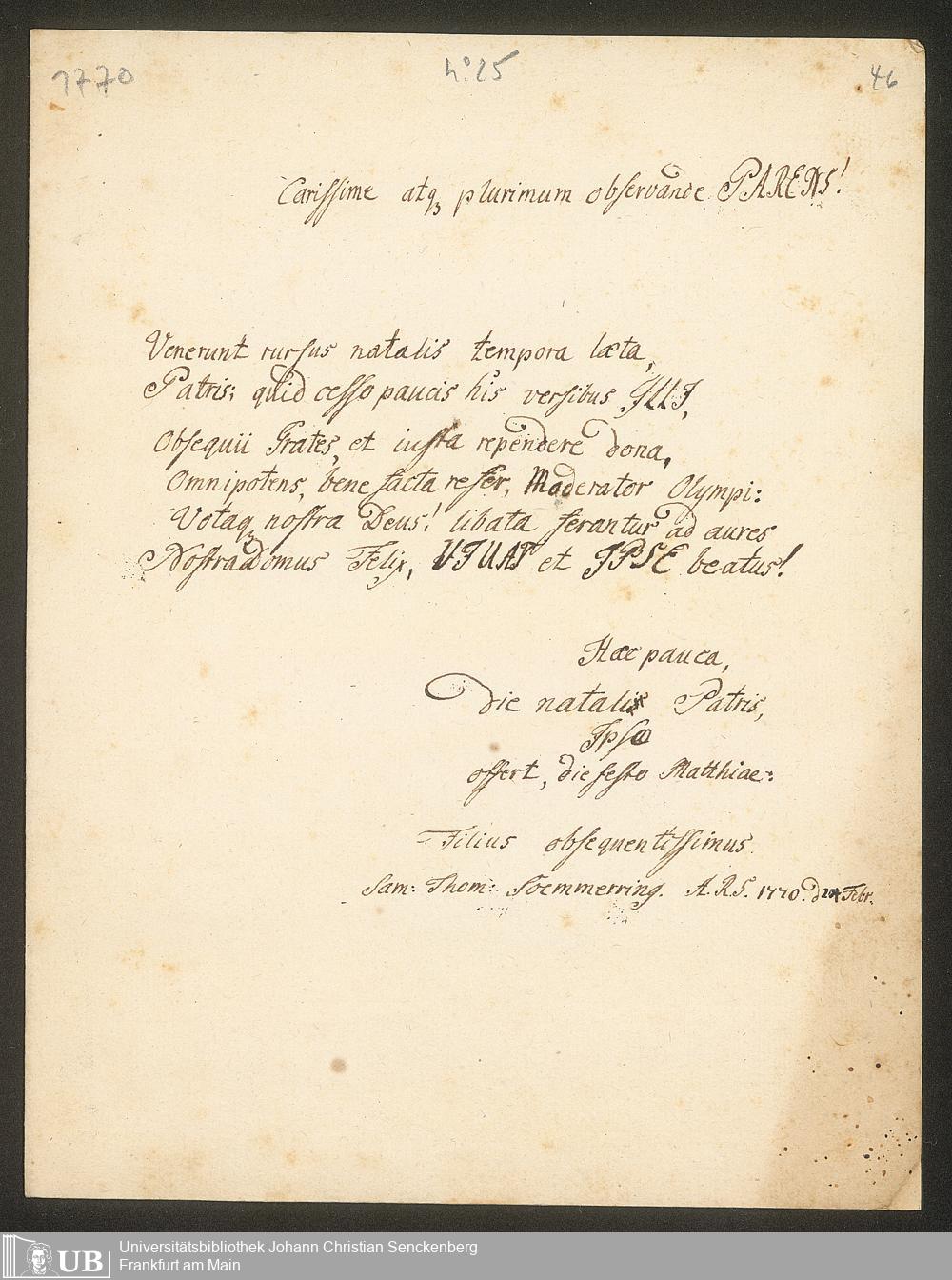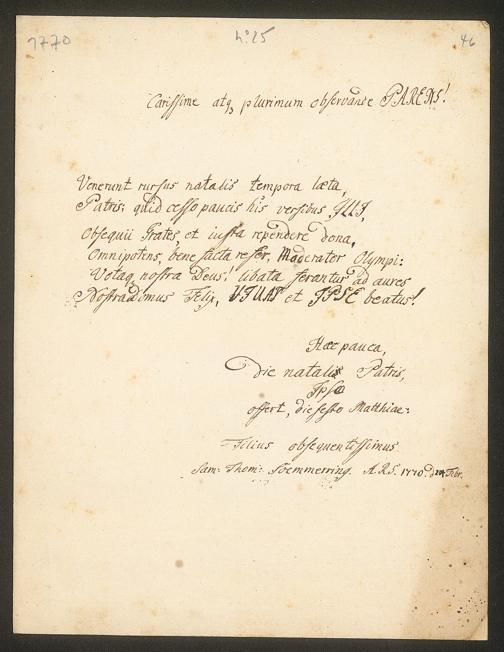 Ms. Ff. S. Th. v. Soemmerring 7 B - 43 Neujahrs-, Weihnachts-, Geburtstags- und Namenstagsgratulationen in Versen und in Prosa an beide Eltern, besonders an den Vater gerichtet. 1 Neujahrsschreiben der Mutter.