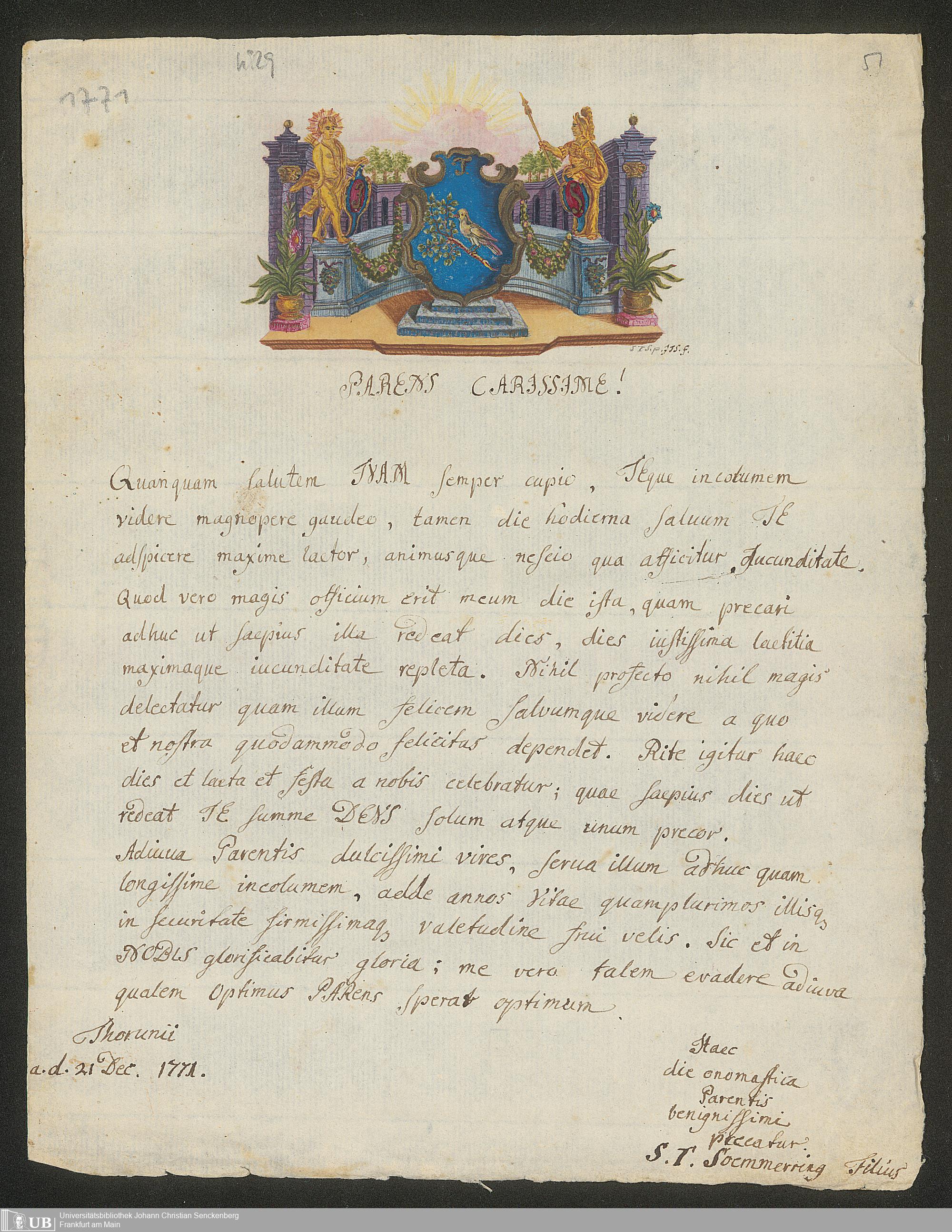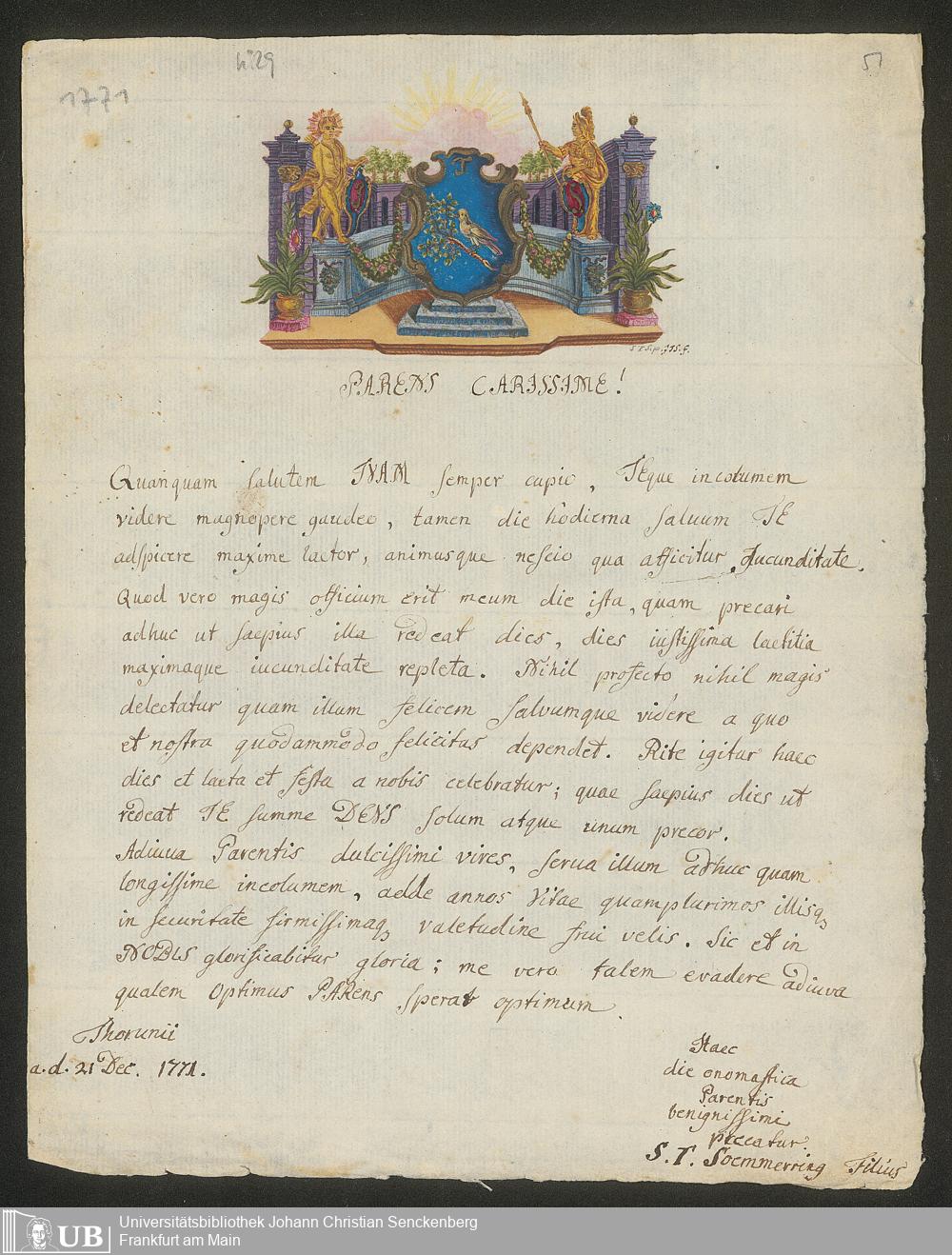 Ms. Ff. S. Th. v. Soemmerring 7 B - 43 Neujahrs-, Weihnachts-, Geburtstags- und Namenstagsgratulationen in Versen und in Prosa an beide Eltern, besonders an den Vater gerichtet. 1 Neujahrsschreiben der Mutter.