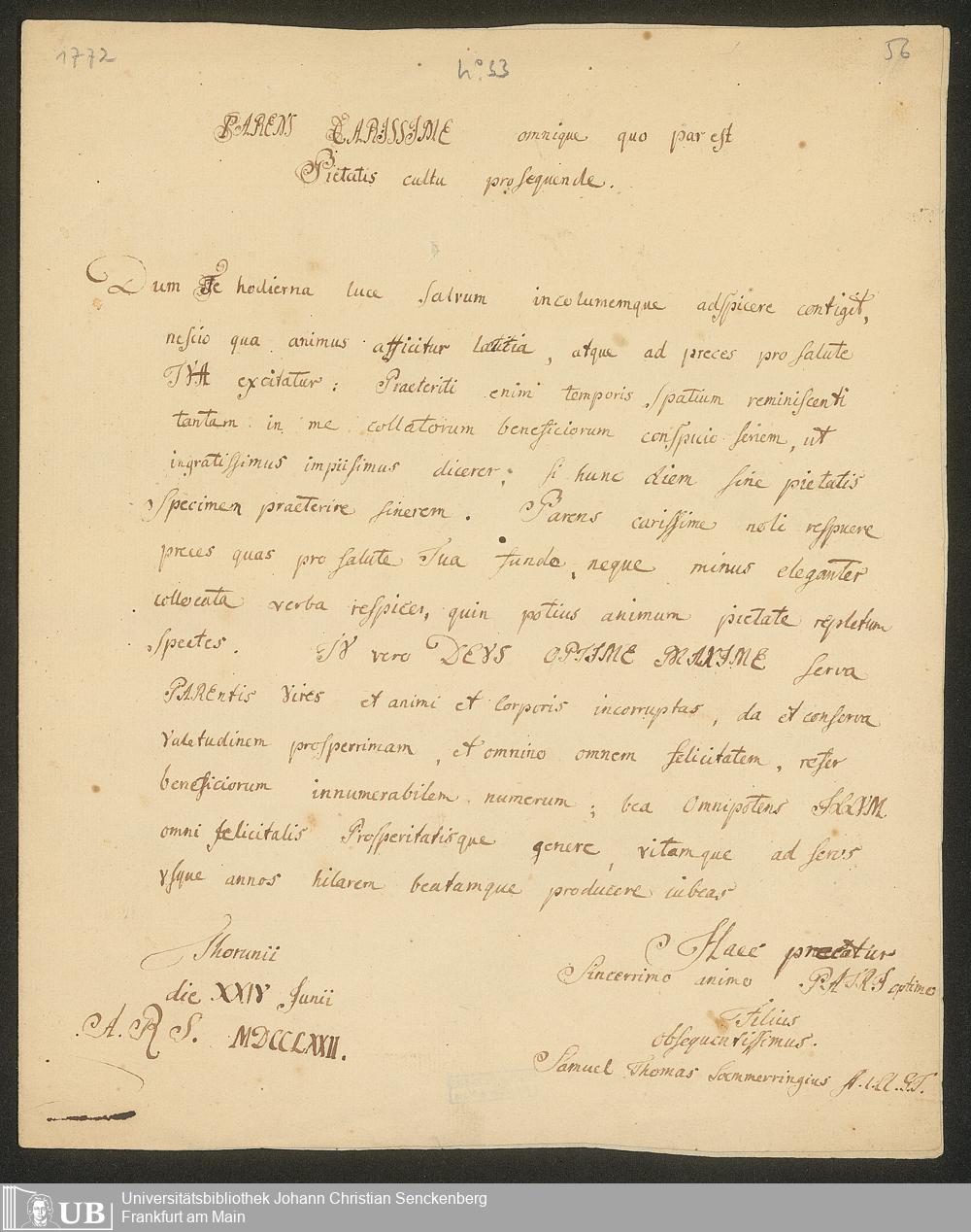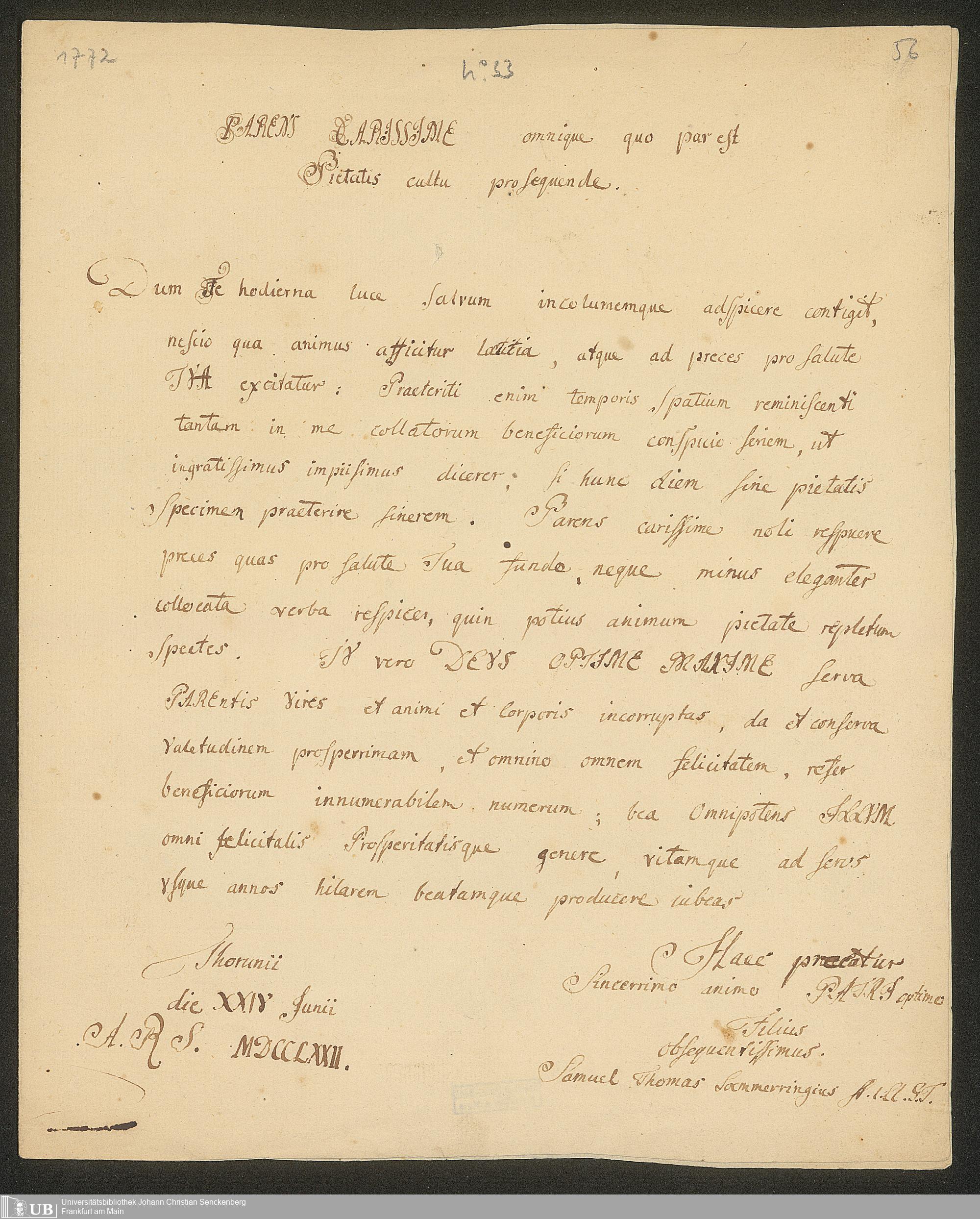 Ms. Ff. S. Th. v. Soemmerring 7 B - 43 Neujahrs-, Weihnachts-, Geburtstags- und Namenstagsgratulationen in Versen und in Prosa an beide Eltern, besonders an den Vater gerichtet. 1 Neujahrsschreiben der Mutter.