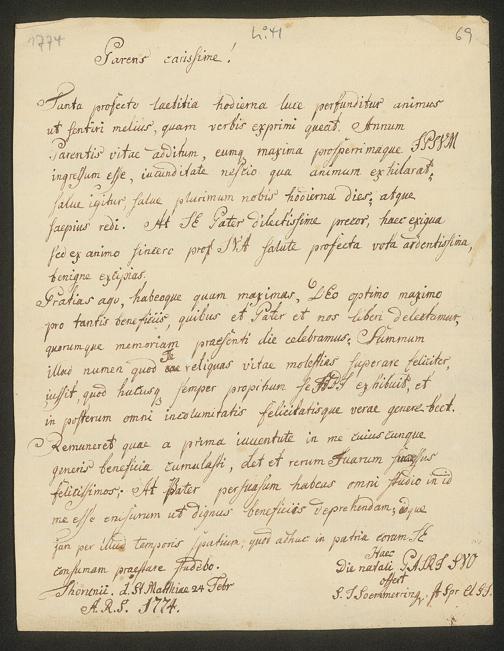 Ms. Ff. S. Th. v. Soemmerring 7 B - 43 Neujahrs-, Weihnachts-, Geburtstags- und Namenstagsgratulationen in Versen und in Prosa an beide Eltern, besonders an den Vater gerichtet. 1 Neujahrsschreiben der Mutter.