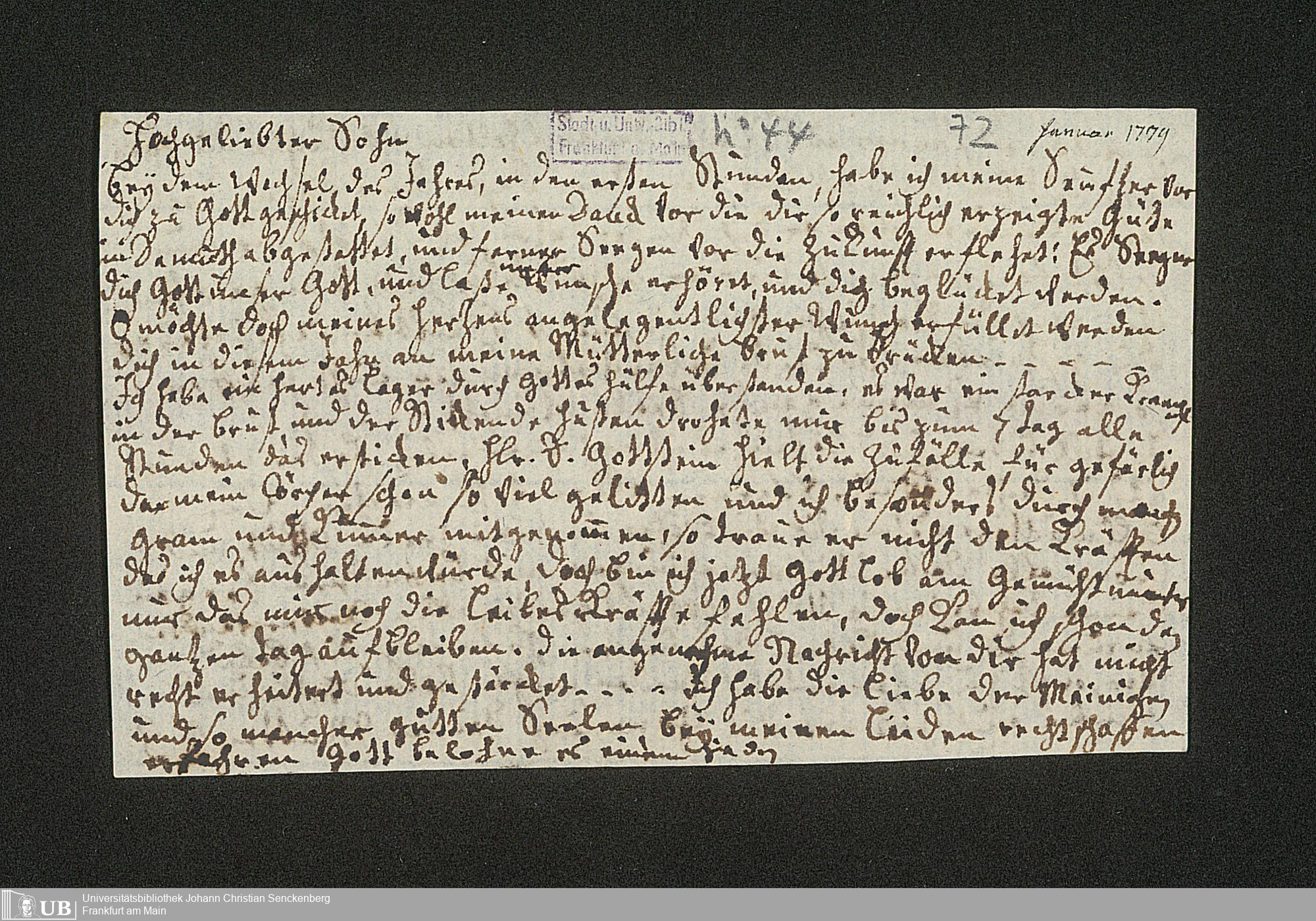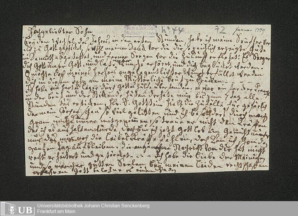 Ms. Ff. S. Th. v. Soemmerring 7 B - 43 Neujahrs-, Weihnachts-, Geburtstags- und Namenstagsgratulationen in Versen und in Prosa an beide Eltern, besonders an den Vater gerichtet. 1 Neujahrsschreiben der Mutter.