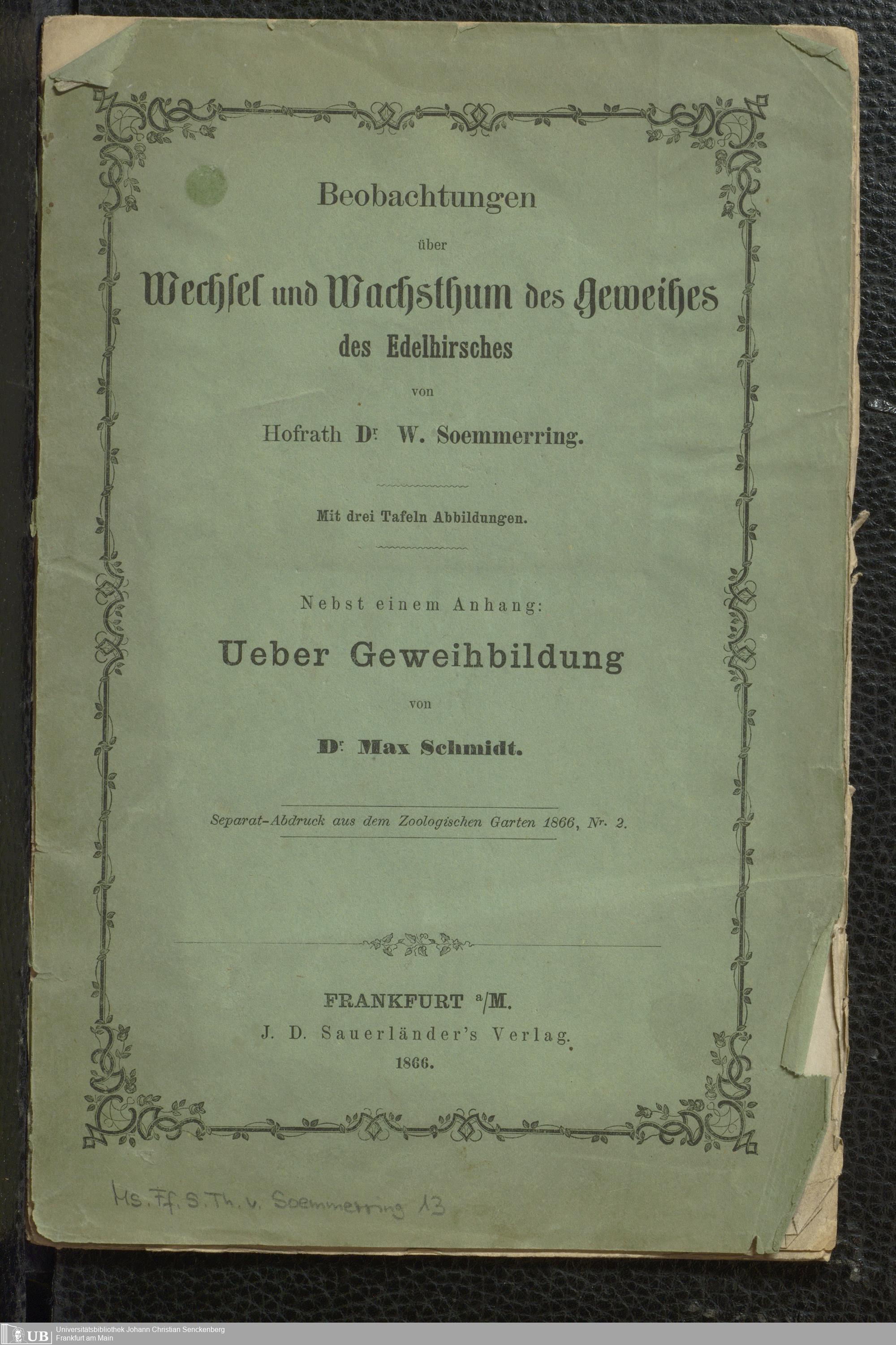 Ms. Ff. S. Th. v. Soemmerring 13 - Beobachtungen über Wechsel und Wachsthum des Geweihes des Edelhirsches. Nebst einem Anhang: Ueber Geweihbildung von Dr. Max Schmidt