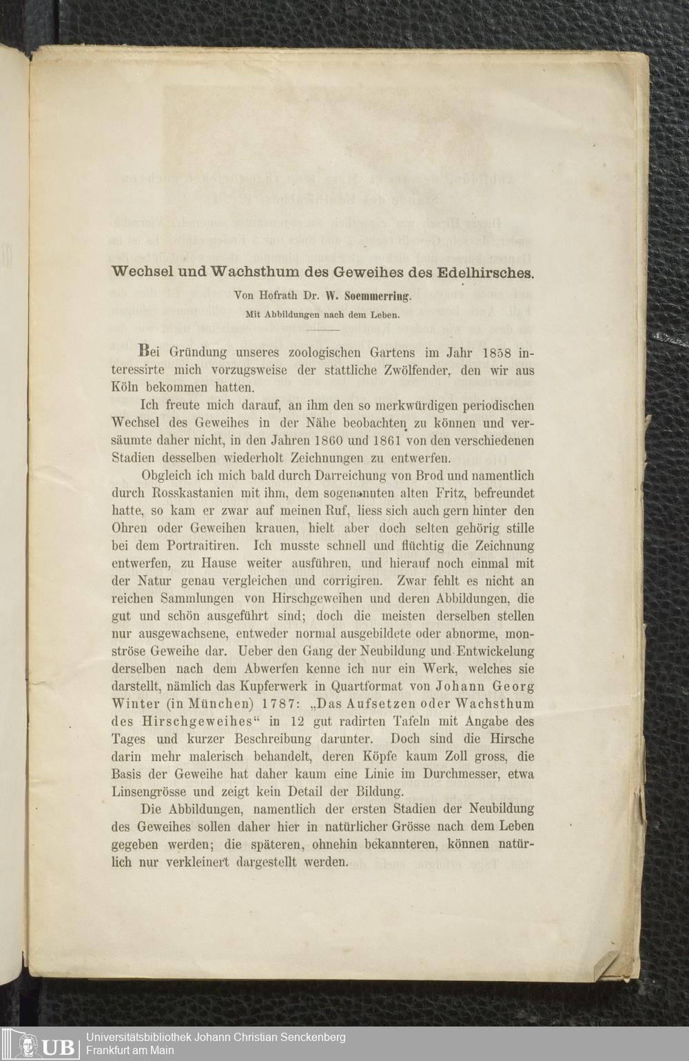 Ms. Ff. S. Th. v. Soemmerring 13 - Beobachtungen über Wechsel und Wachsthum des Geweihes des Edelhirsches. Nebst einem Anhang: Ueber Geweihbildung von Dr. Max Schmidt