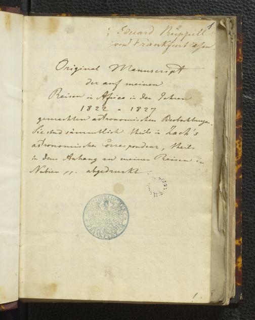 Ms. Ff. E. Rüppell I - Original Manuscript der auf meinen Reisen in Africa in den Jahren 1822 - 1827 gemachten astronomischen Beobachtungen. Sie sind sämmtlich theils in Zach's astronomischer Correspondenz, theils in dem Anhang zu meinen Reisen in Nubien pp. abgedruckt