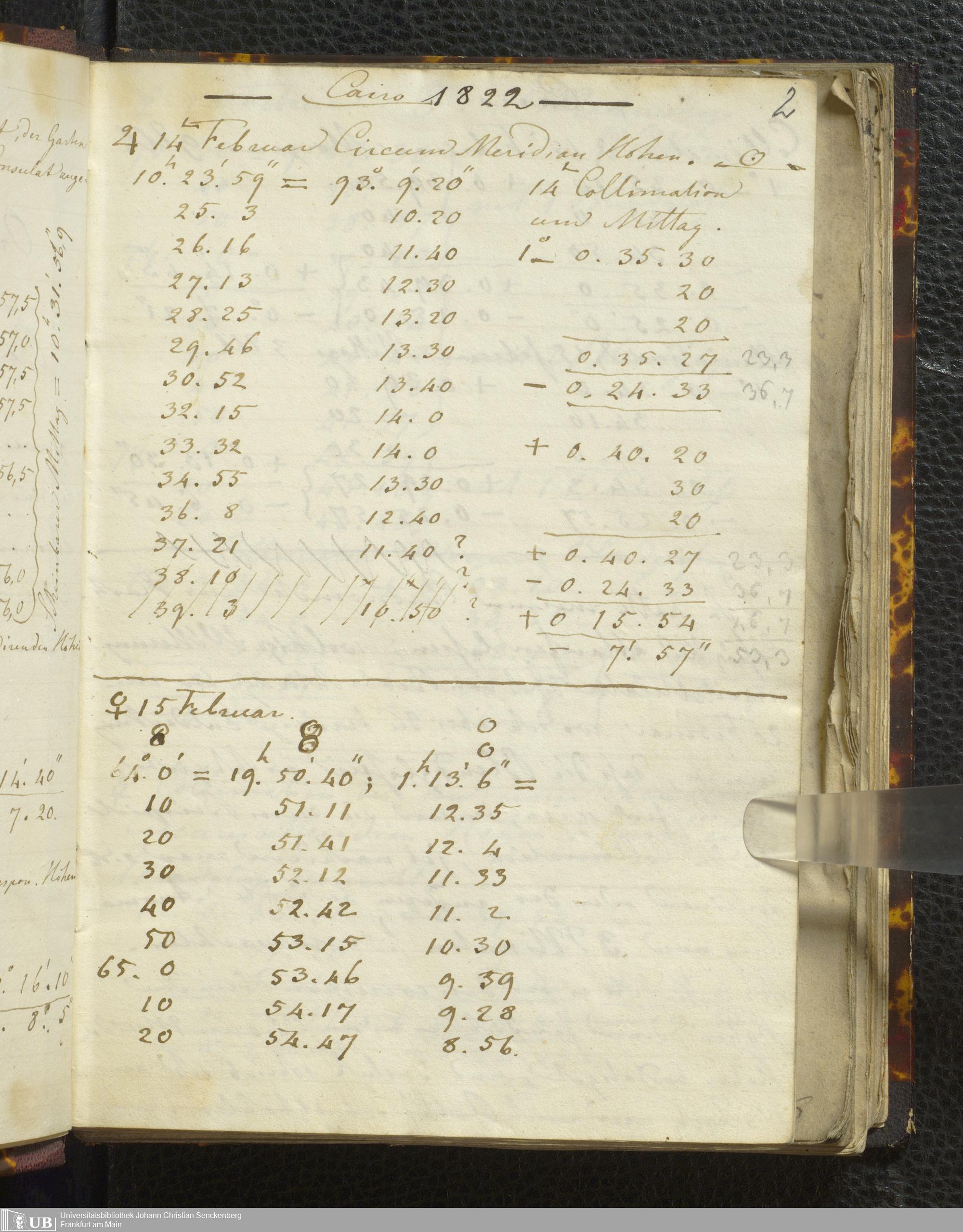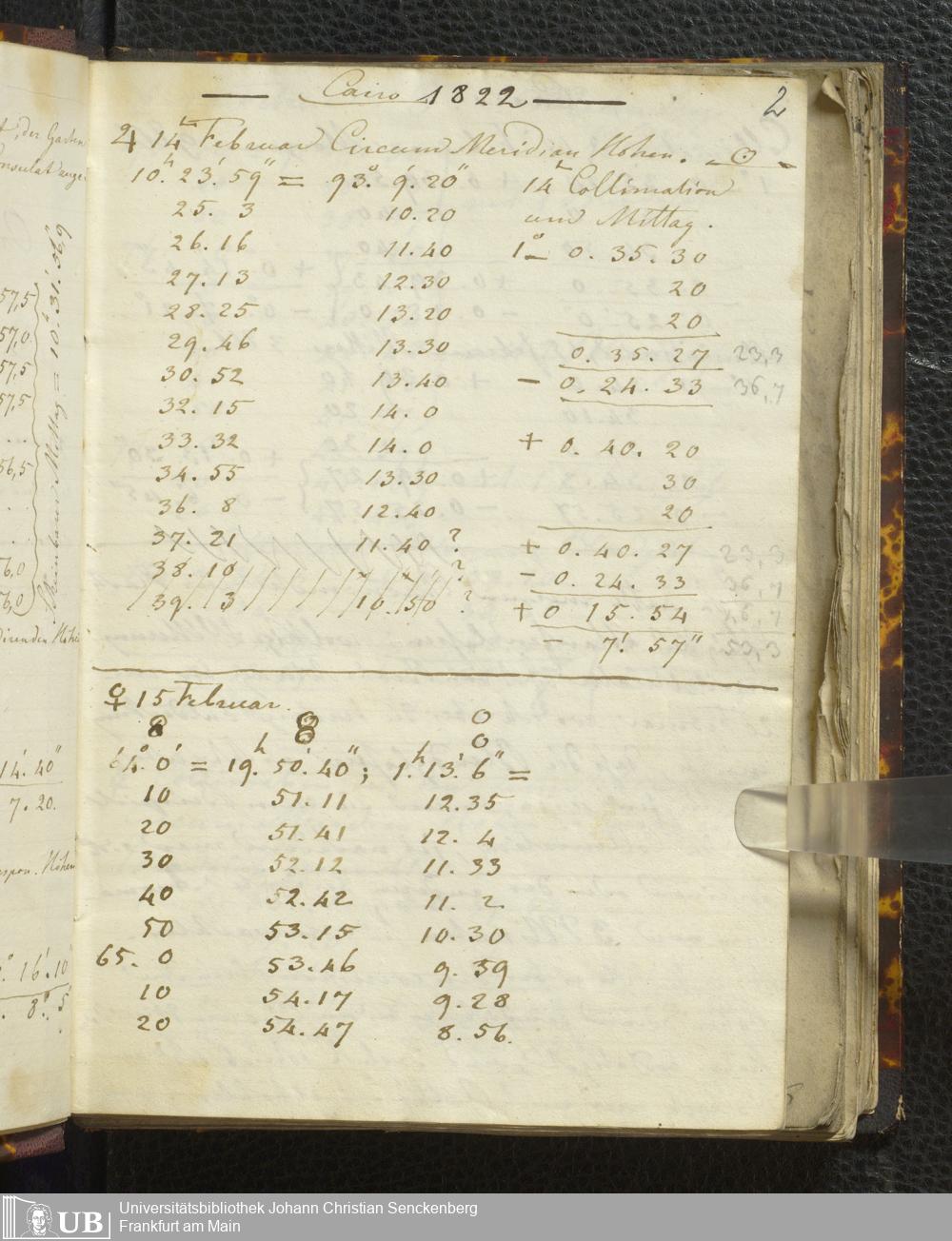 Ms. Ff. E. Rüppell I - Original Manuscript der auf meinen Reisen in Africa in den Jahren 1822 - 1827 gemachten astronomischen Beobachtungen. Sie sind sämmtlich theils in Zach's astronomischer Correspondenz, theils in dem Anhang zu meinen Reisen in Nubien pp. abgedruckt