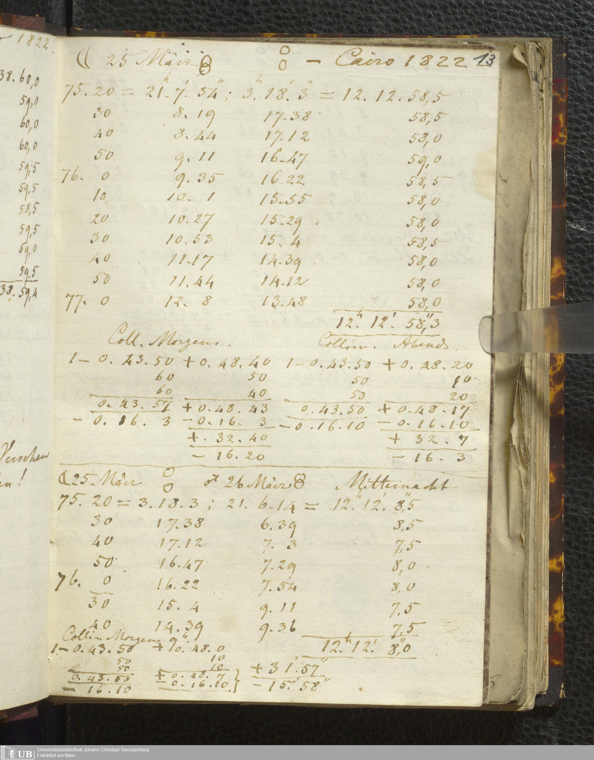 Ms. Ff. E. Rüppell I - Original Manuscript der auf meinen Reisen in Africa in den Jahren 1822 - 1827 gemachten astronomischen Beobachtungen. Sie sind sämmtlich theils in Zach's astronomischer Correspondenz, theils in dem Anhang zu meinen Reisen in Nubien pp. abgedruckt