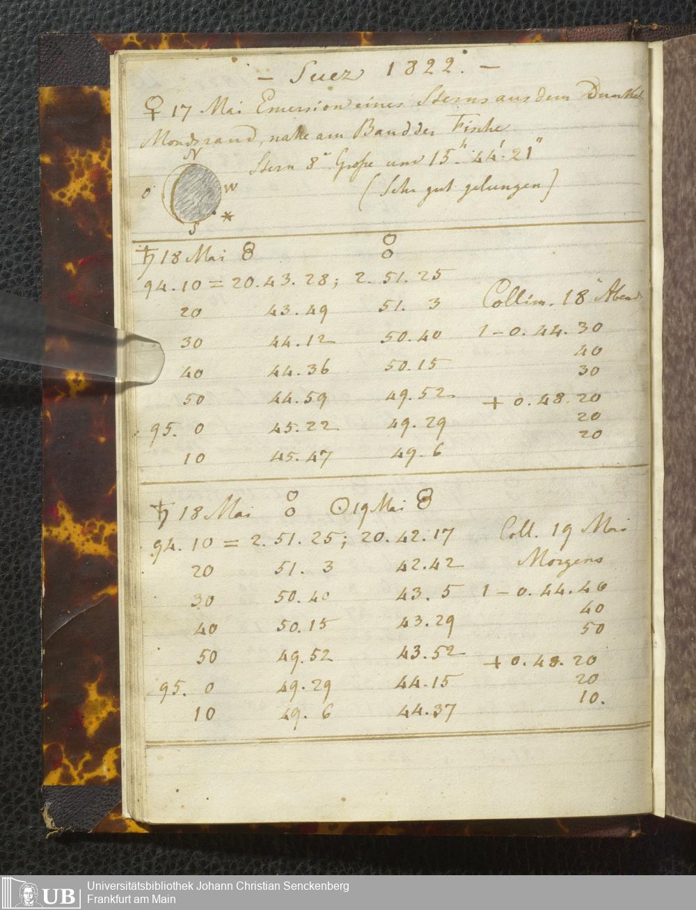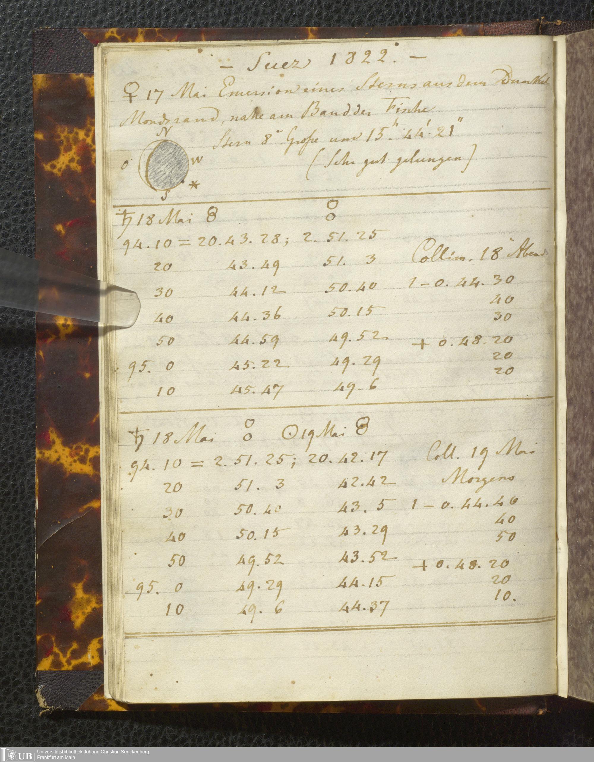 Ms. Ff. E. Rüppell I - Original Manuscript der auf meinen Reisen in Africa in den Jahren 1822 - 1827 gemachten astronomischen Beobachtungen. Sie sind sämmtlich theils in Zach's astronomischer Correspondenz, theils in dem Anhang zu meinen Reisen in Nubien pp. abgedruckt