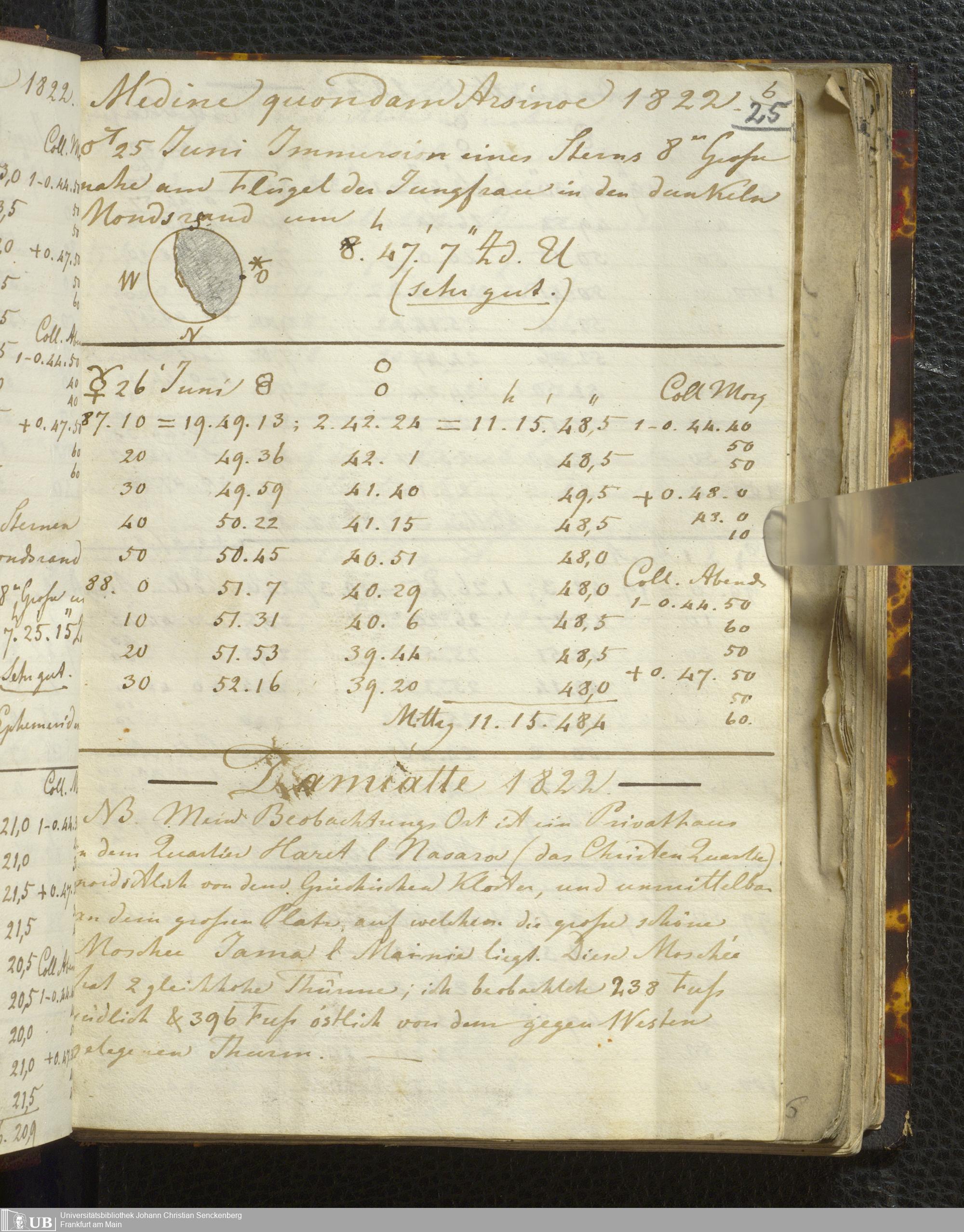 Ms. Ff. E. Rüppell I - Original Manuscript der auf meinen Reisen in Africa in den Jahren 1822 - 1827 gemachten astronomischen Beobachtungen. Sie sind sämmtlich theils in Zach's astronomischer Correspondenz, theils in dem Anhang zu meinen Reisen in Nubien pp. abgedruckt