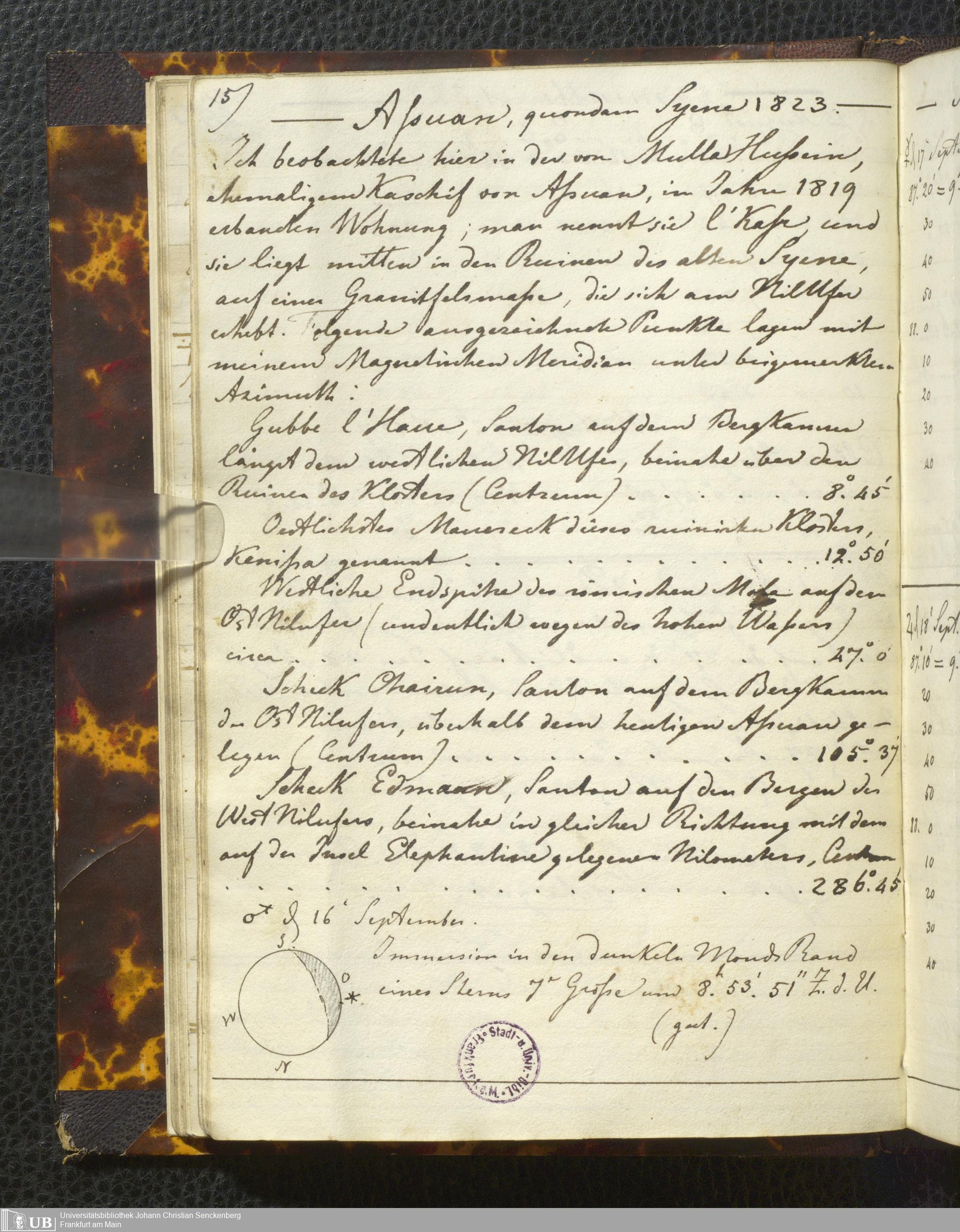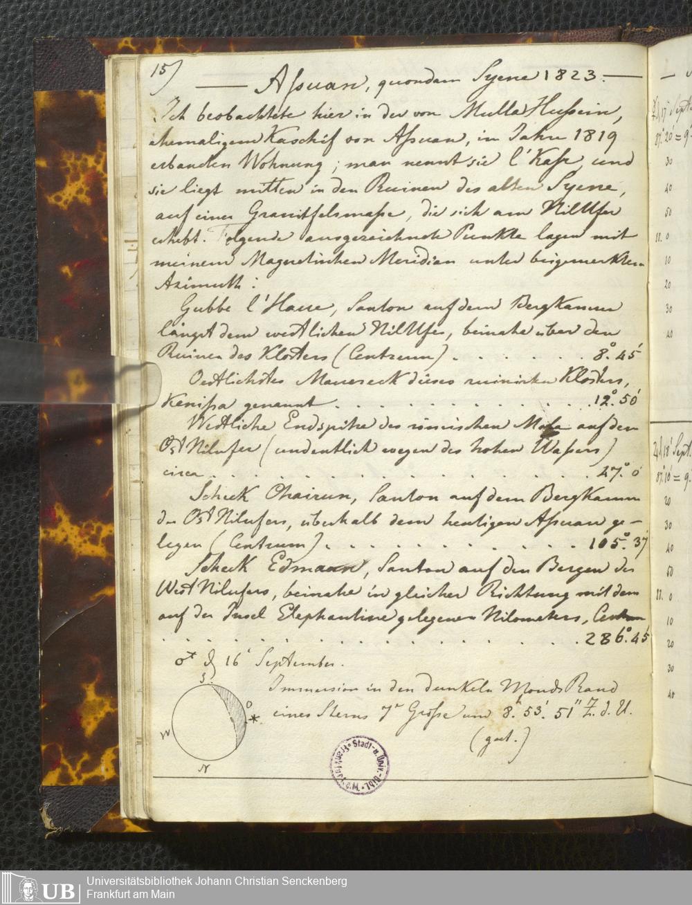 Ms. Ff. E. Rüppell I - Original Manuscript der auf meinen Reisen in Africa in den Jahren 1822 - 1827 gemachten astronomischen Beobachtungen. Sie sind sämmtlich theils in Zach's astronomischer Correspondenz, theils in dem Anhang zu meinen Reisen in Nubien pp. abgedruckt