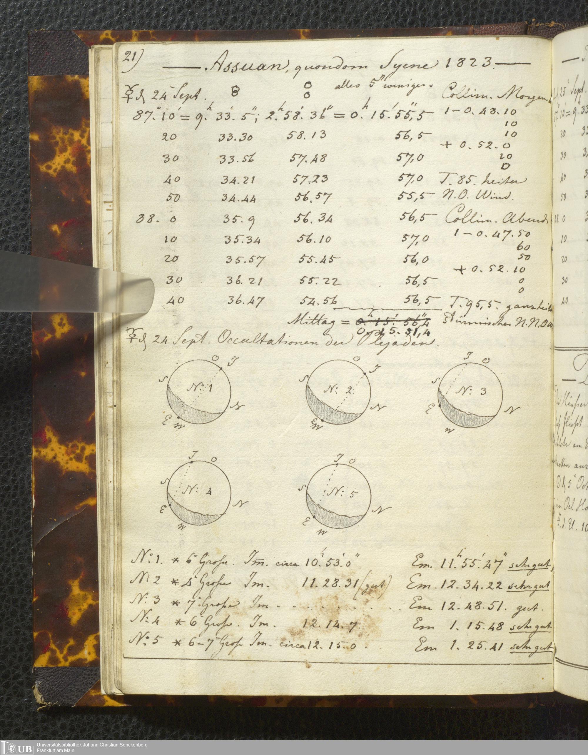 Ms. Ff. E. Rüppell I - Original Manuscript der auf meinen Reisen in Africa in den Jahren 1822 - 1827 gemachten astronomischen Beobachtungen. Sie sind sämmtlich theils in Zach's astronomischer Correspondenz, theils in dem Anhang zu meinen Reisen in Nubien pp. abgedruckt
