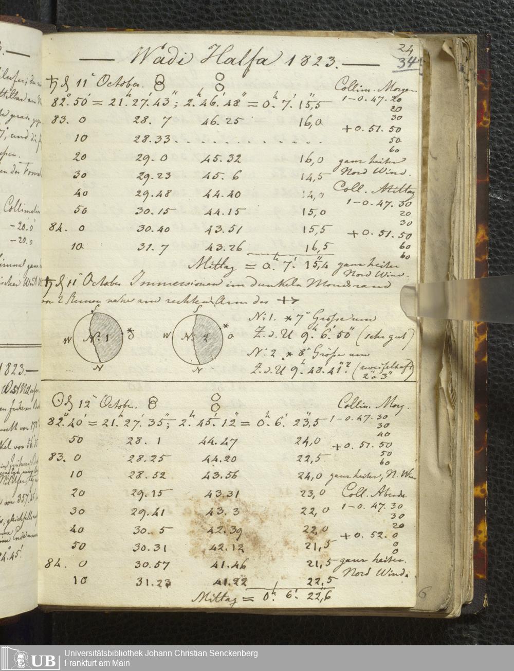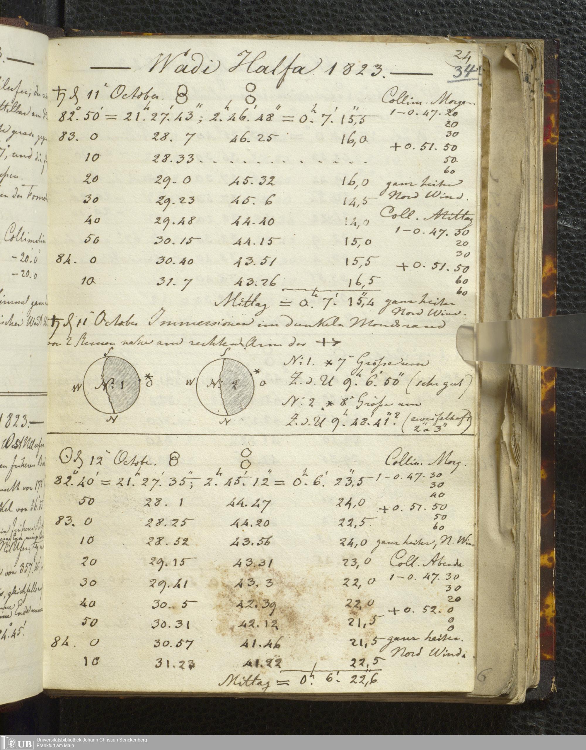 Ms. Ff. E. Rüppell I - Original Manuscript der auf meinen Reisen in Africa in den Jahren 1822 - 1827 gemachten astronomischen Beobachtungen. Sie sind sämmtlich theils in Zach's astronomischer Correspondenz, theils in dem Anhang zu meinen Reisen in Nubien pp. abgedruckt