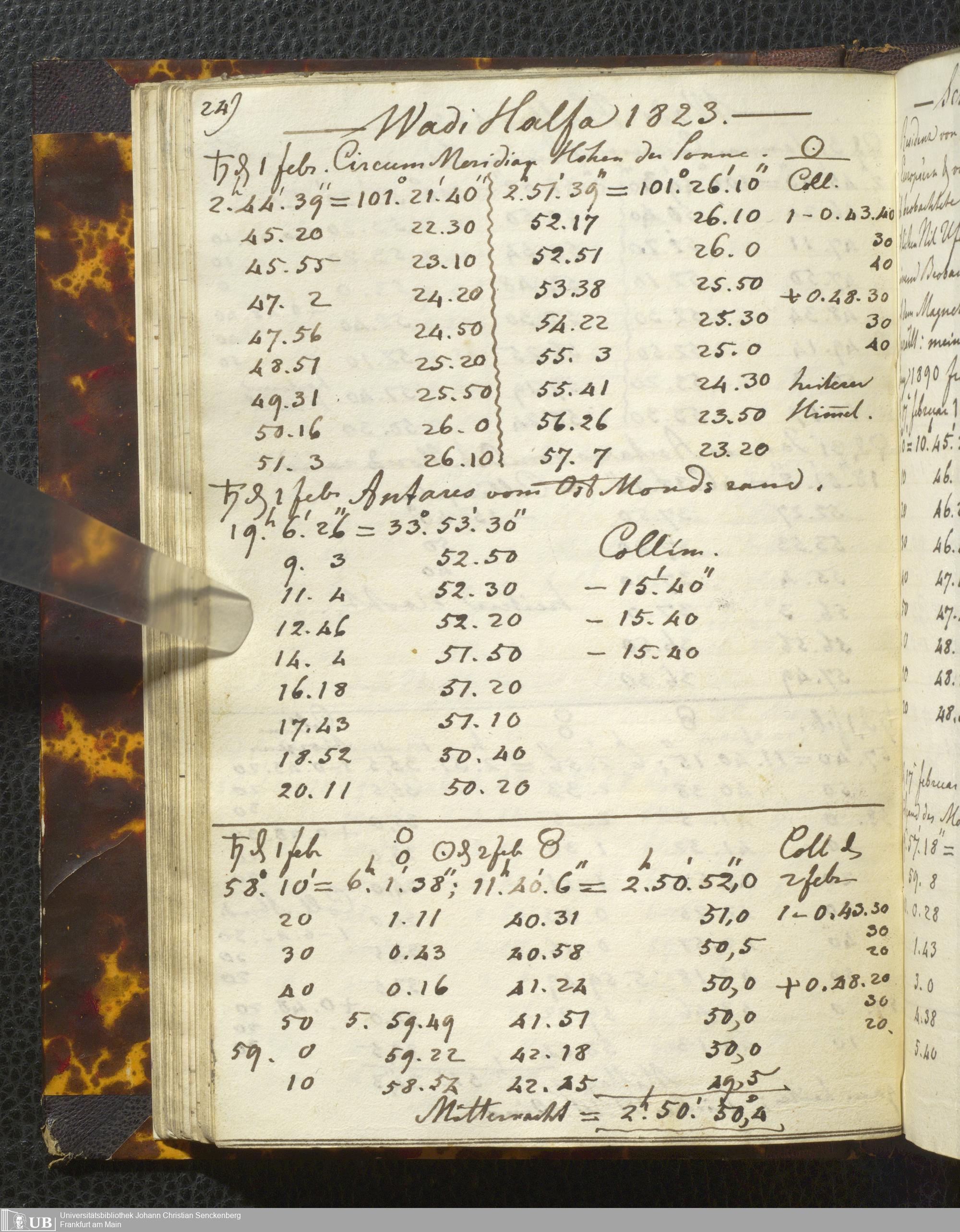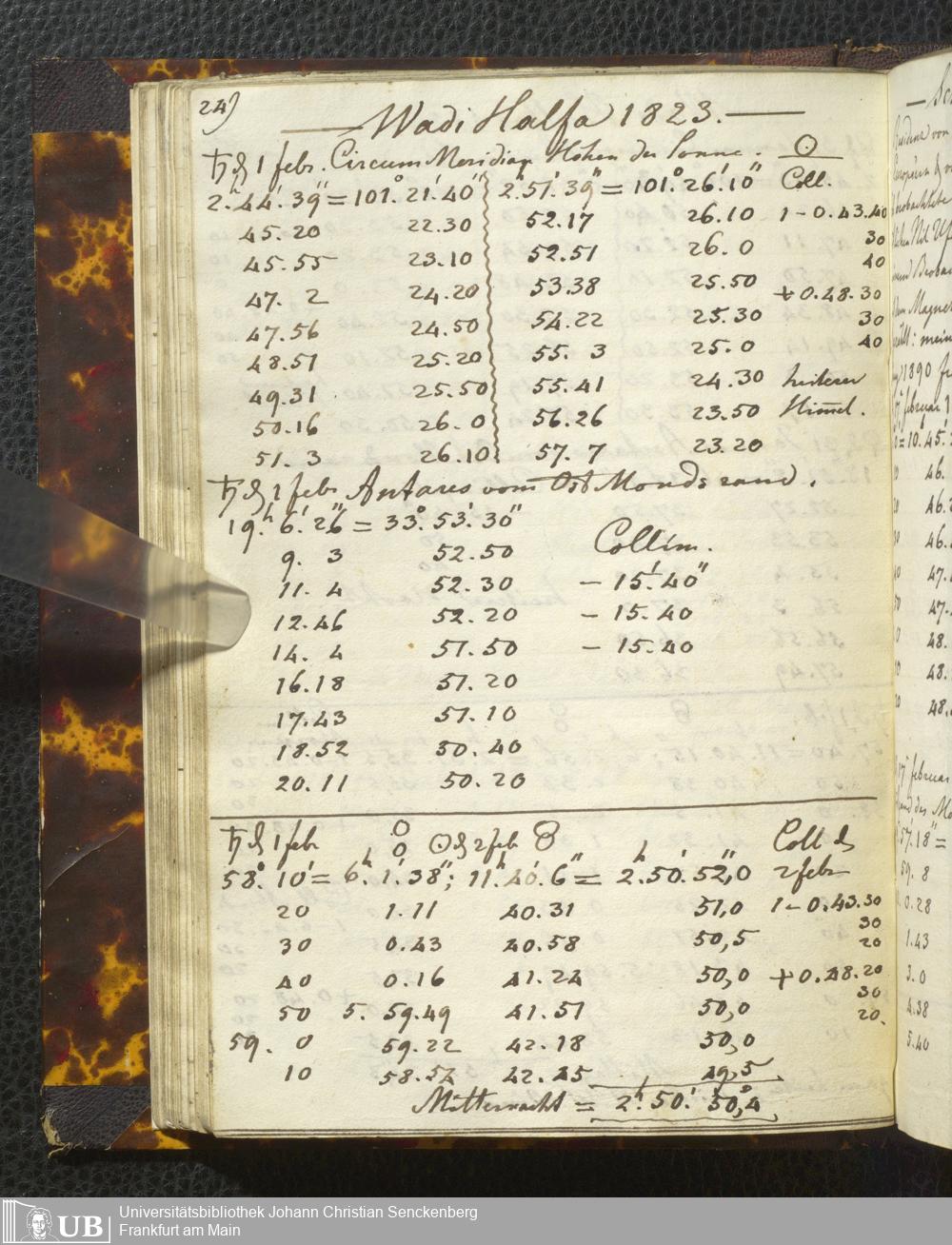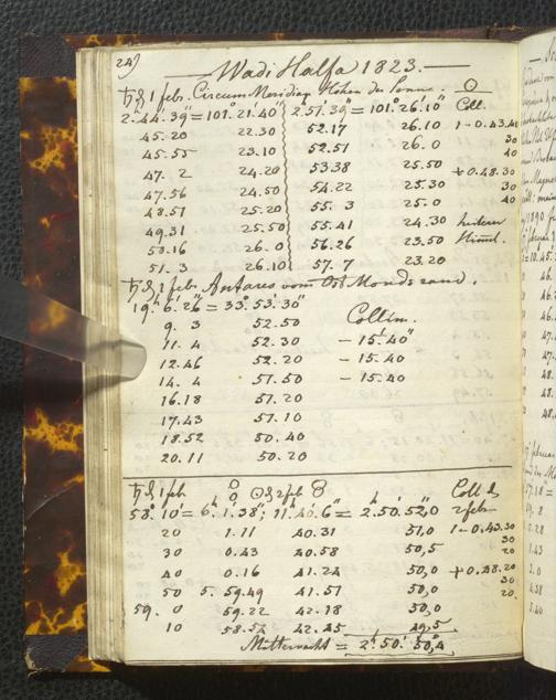Ms. Ff. E. Rüppell I - Original Manuscript der auf meinen Reisen in Africa in den Jahren 1822 - 1827 gemachten astronomischen Beobachtungen. Sie sind sämmtlich theils in Zach's astronomischer Correspondenz, theils in dem Anhang zu meinen Reisen in Nubien pp. abgedruckt
