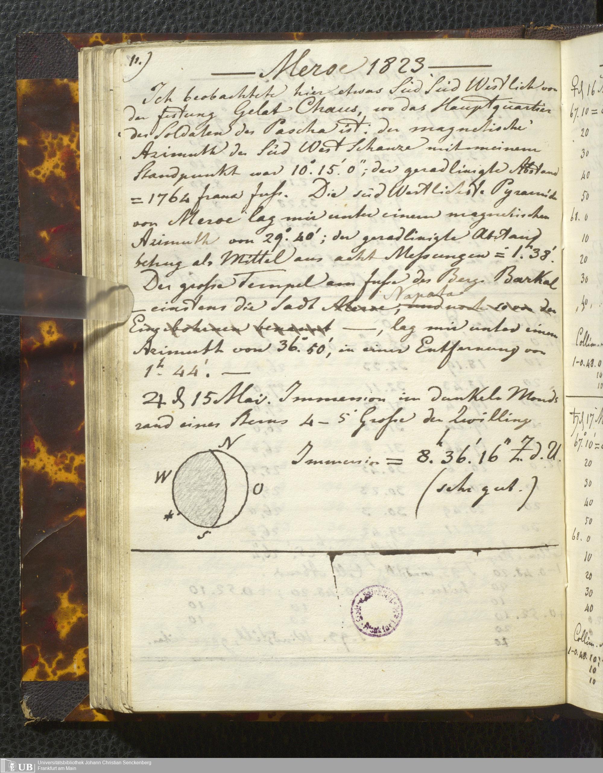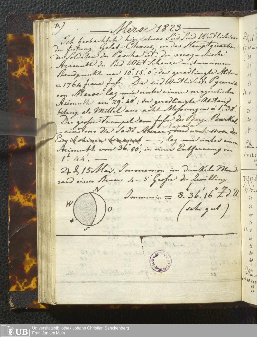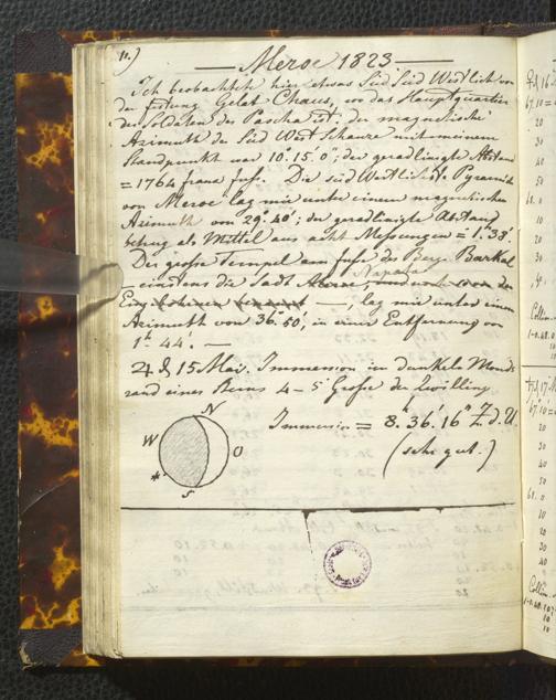 Ms. Ff. E. Rüppell I - Original Manuscript der auf meinen Reisen in Africa in den Jahren 1822 - 1827 gemachten astronomischen Beobachtungen. Sie sind sämmtlich theils in Zach's astronomischer Correspondenz, theils in dem Anhang zu meinen Reisen in Nubien pp. abgedruckt