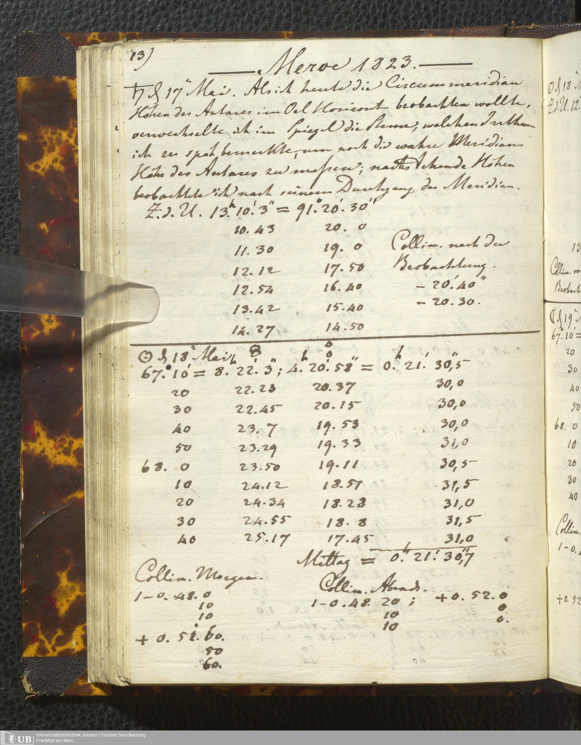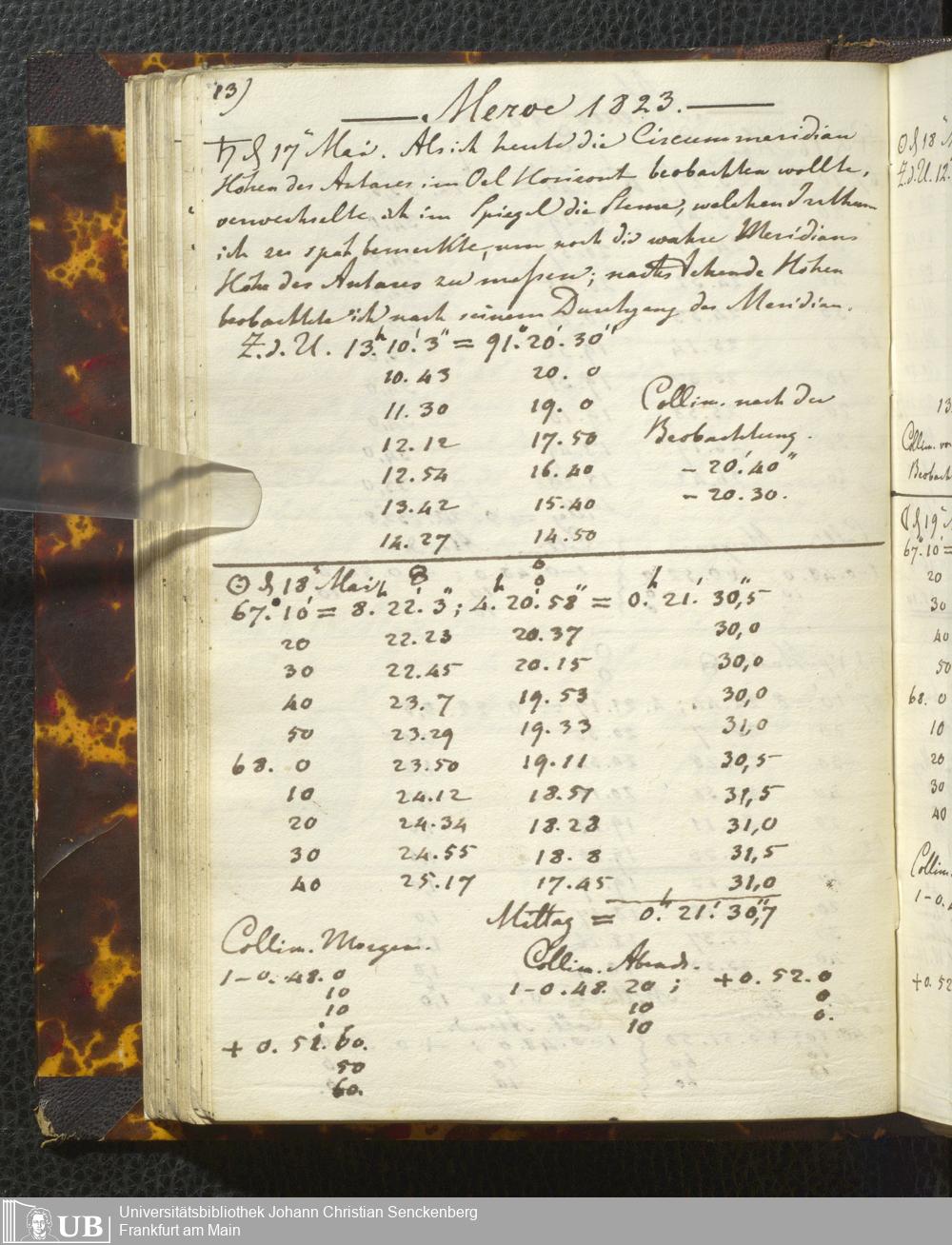 Ms. Ff. E. Rüppell I - Original Manuscript der auf meinen Reisen in Africa in den Jahren 1822 - 1827 gemachten astronomischen Beobachtungen. Sie sind sämmtlich theils in Zach's astronomischer Correspondenz, theils in dem Anhang zu meinen Reisen in Nubien pp. abgedruckt
