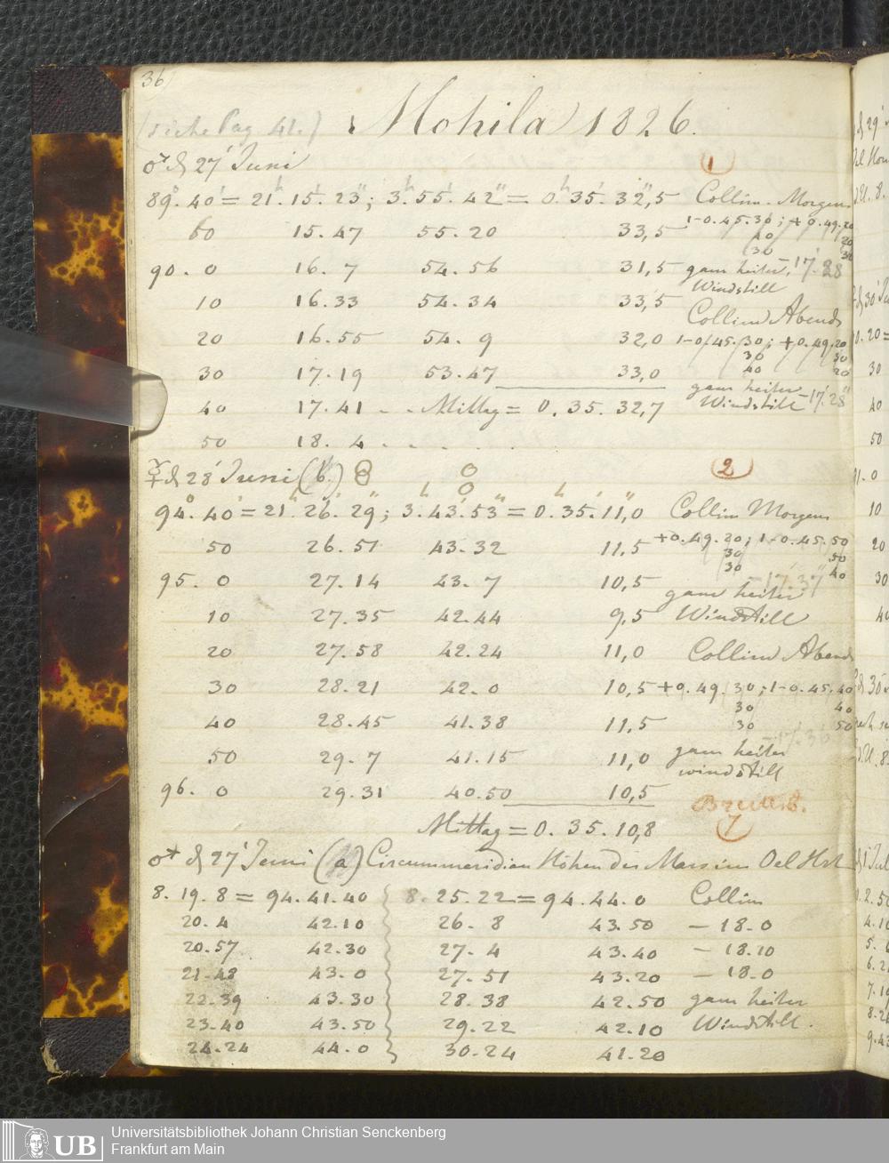 Ms. Ff. E. Rüppell I - Original Manuscript der auf meinen Reisen in Africa in den Jahren 1822 - 1827 gemachten astronomischen Beobachtungen. Sie sind sämmtlich theils in Zach's astronomischer Correspondenz, theils in dem Anhang zu meinen Reisen in Nubien pp. abgedruckt