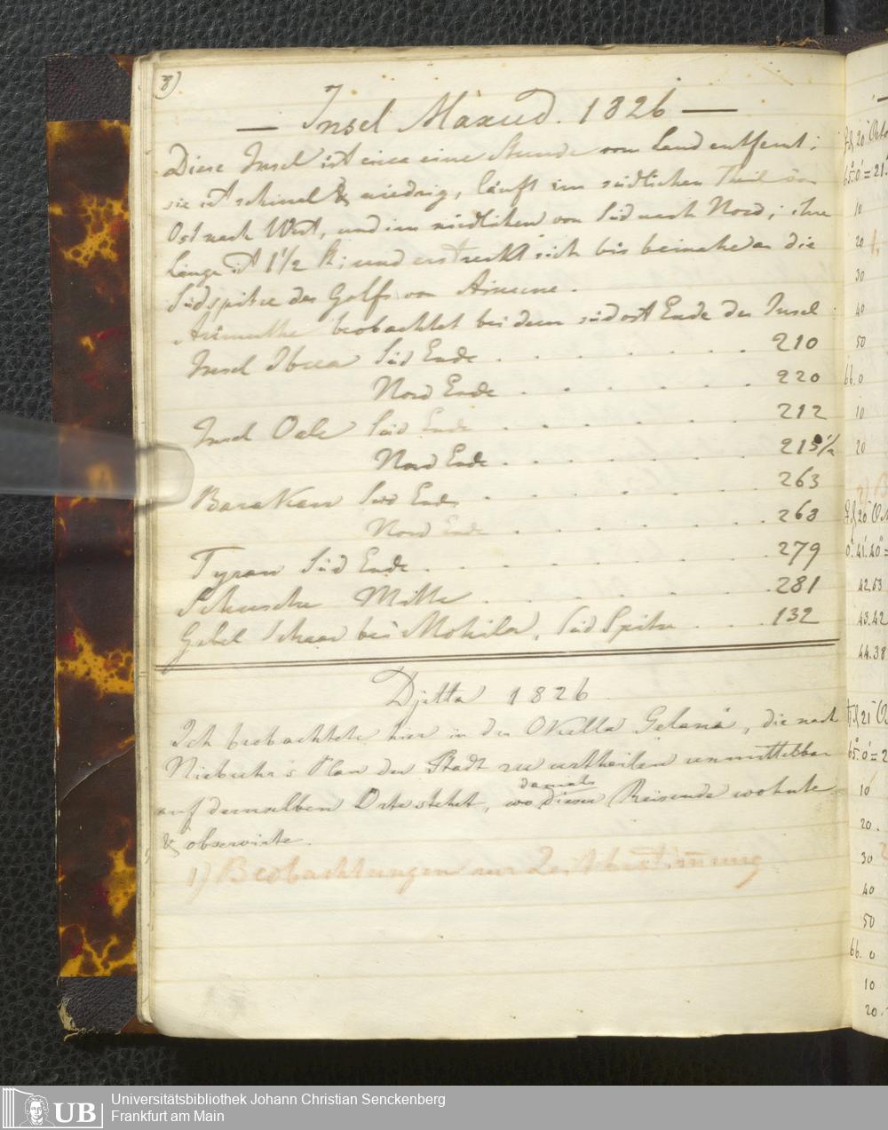 Ms. Ff. E. Rüppell I - Original Manuscript der auf meinen Reisen in Africa in den Jahren 1822 - 1827 gemachten astronomischen Beobachtungen. Sie sind sämmtlich theils in Zach's astronomischer Correspondenz, theils in dem Anhang zu meinen Reisen in Nubien pp. abgedruckt