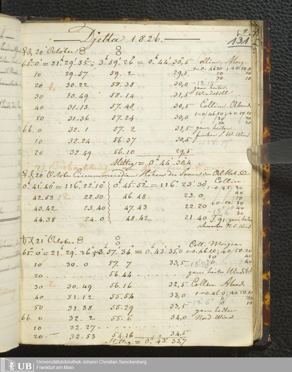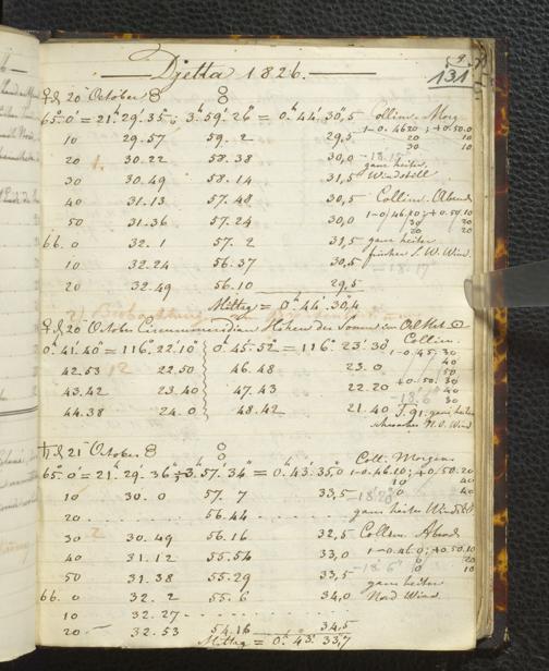 Ms. Ff. E. Rüppell I - Original Manuscript der auf meinen Reisen in Africa in den Jahren 1822 - 1827 gemachten astronomischen Beobachtungen. Sie sind sämmtlich theils in Zach's astronomischer Correspondenz, theils in dem Anhang zu meinen Reisen in Nubien pp. abgedruckt