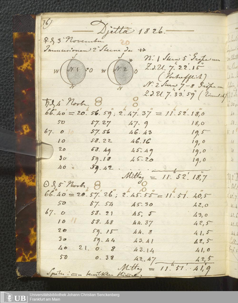 Ms. Ff. E. Rüppell I - Original Manuscript der auf meinen Reisen in Africa in den Jahren 1822 - 1827 gemachten astronomischen Beobachtungen. Sie sind sämmtlich theils in Zach's astronomischer Correspondenz, theils in dem Anhang zu meinen Reisen in Nubien pp. abgedruckt