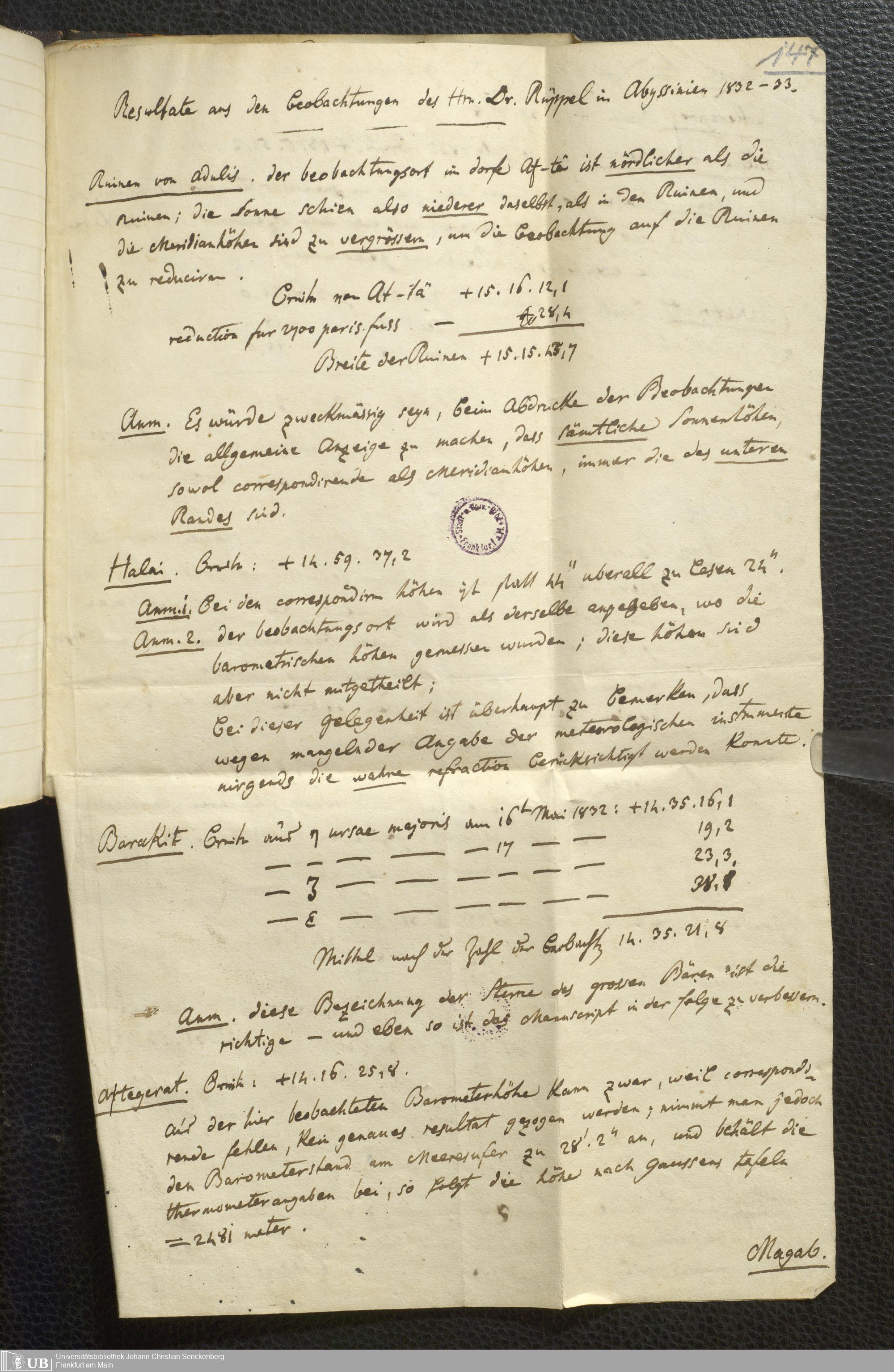 Ms. Ff. E. Rüppell I - Original Manuscript der auf meinen Reisen in Africa in den Jahren 1822 - 1827 gemachten astronomischen Beobachtungen. Sie sind sämmtlich theils in Zach's astronomischer Correspondenz, theils in dem Anhang zu meinen Reisen in Nubien pp. abgedruckt