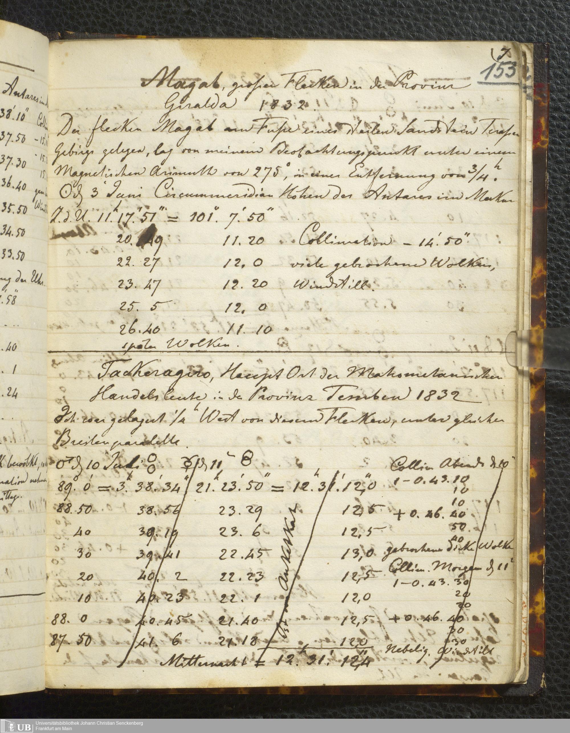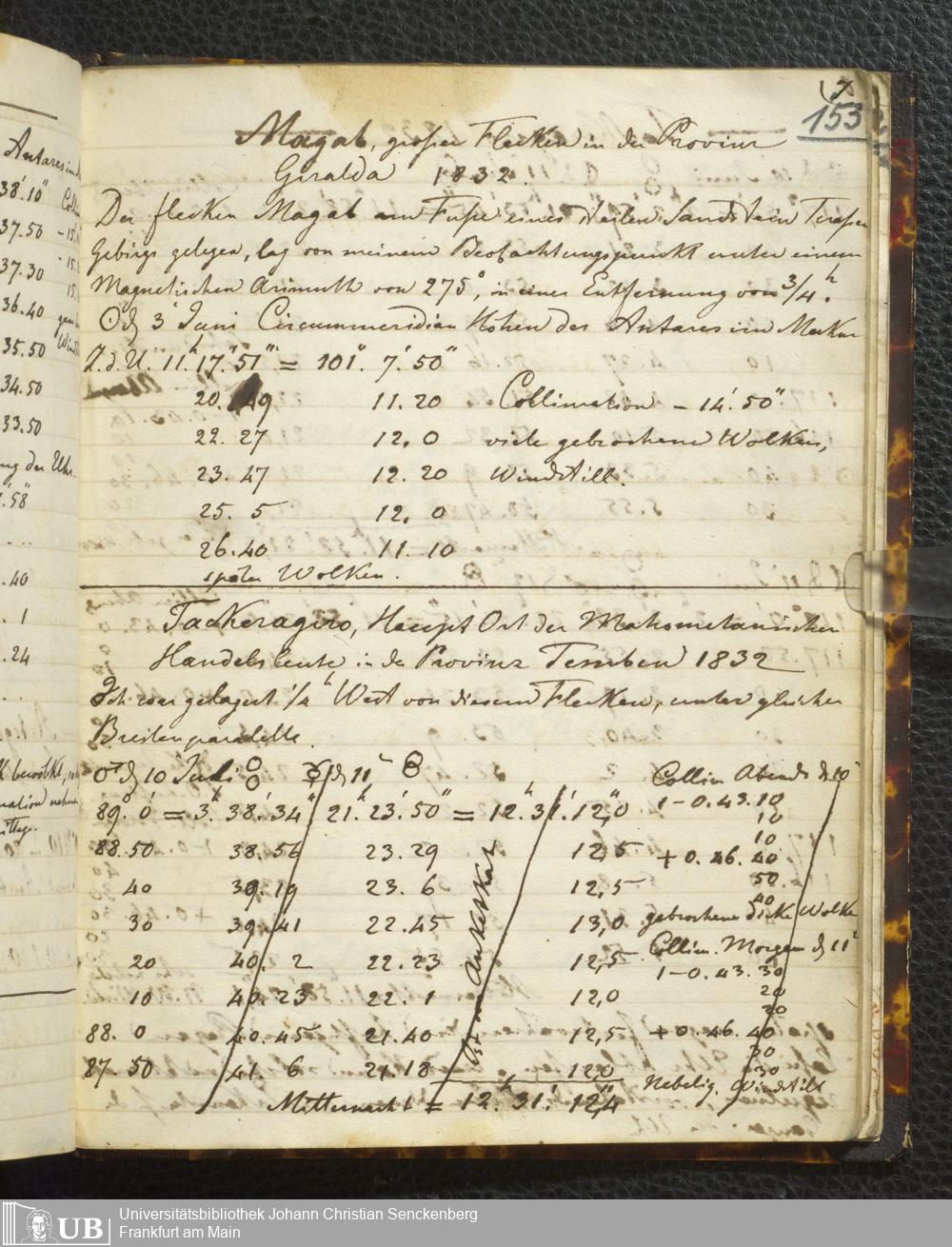 Ms. Ff. E. Rüppell I - Original Manuscript der auf meinen Reisen in Africa in den Jahren 1822 - 1827 gemachten astronomischen Beobachtungen. Sie sind sämmtlich theils in Zach's astronomischer Correspondenz, theils in dem Anhang zu meinen Reisen in Nubien pp. abgedruckt