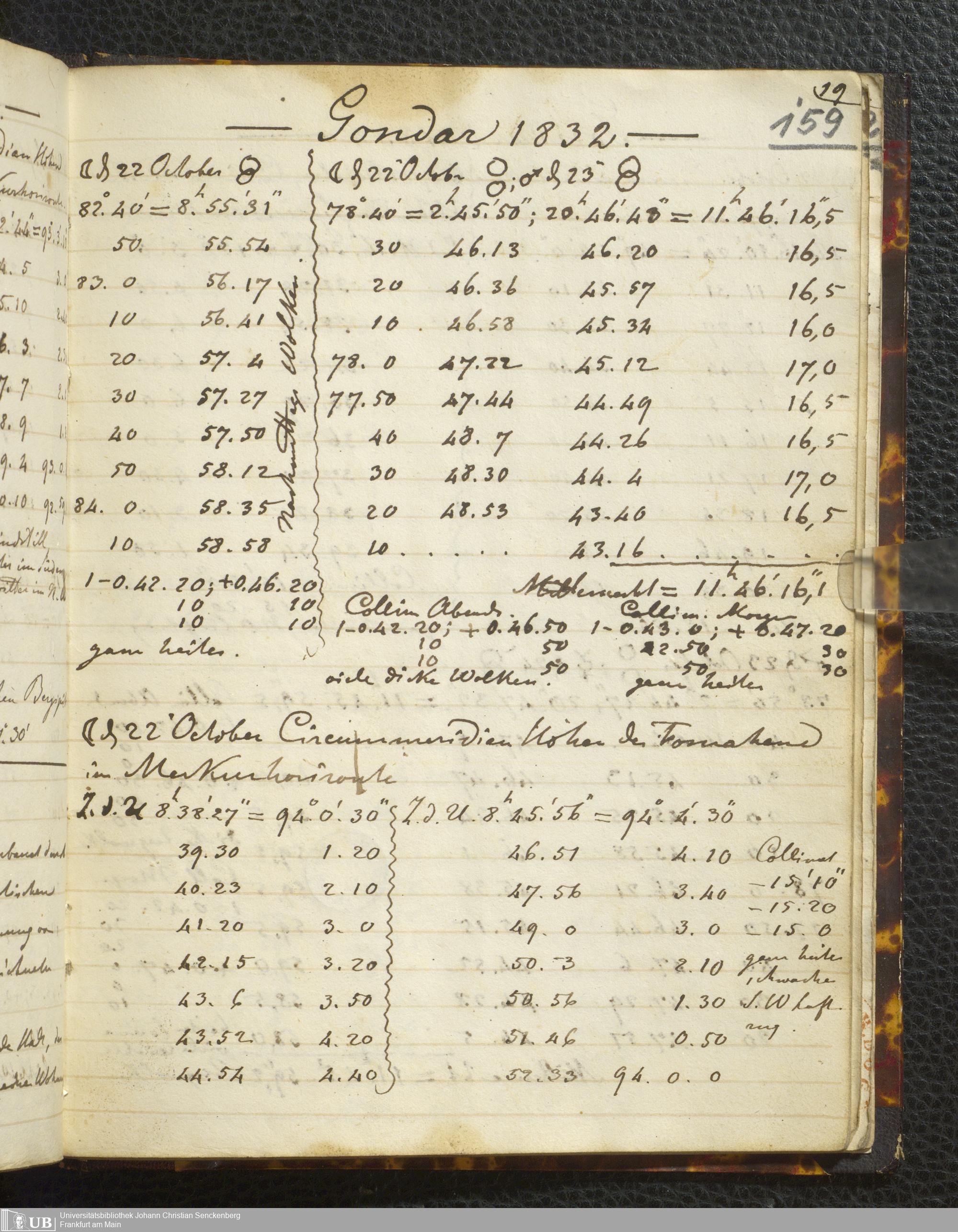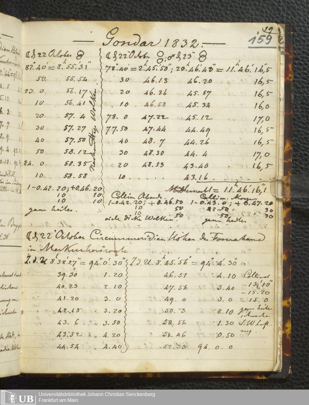 Ms. Ff. E. Rüppell I - Original Manuscript der auf meinen Reisen in Africa in den Jahren 1822 - 1827 gemachten astronomischen Beobachtungen. Sie sind sämmtlich theils in Zach's astronomischer Correspondenz, theils in dem Anhang zu meinen Reisen in Nubien pp. abgedruckt