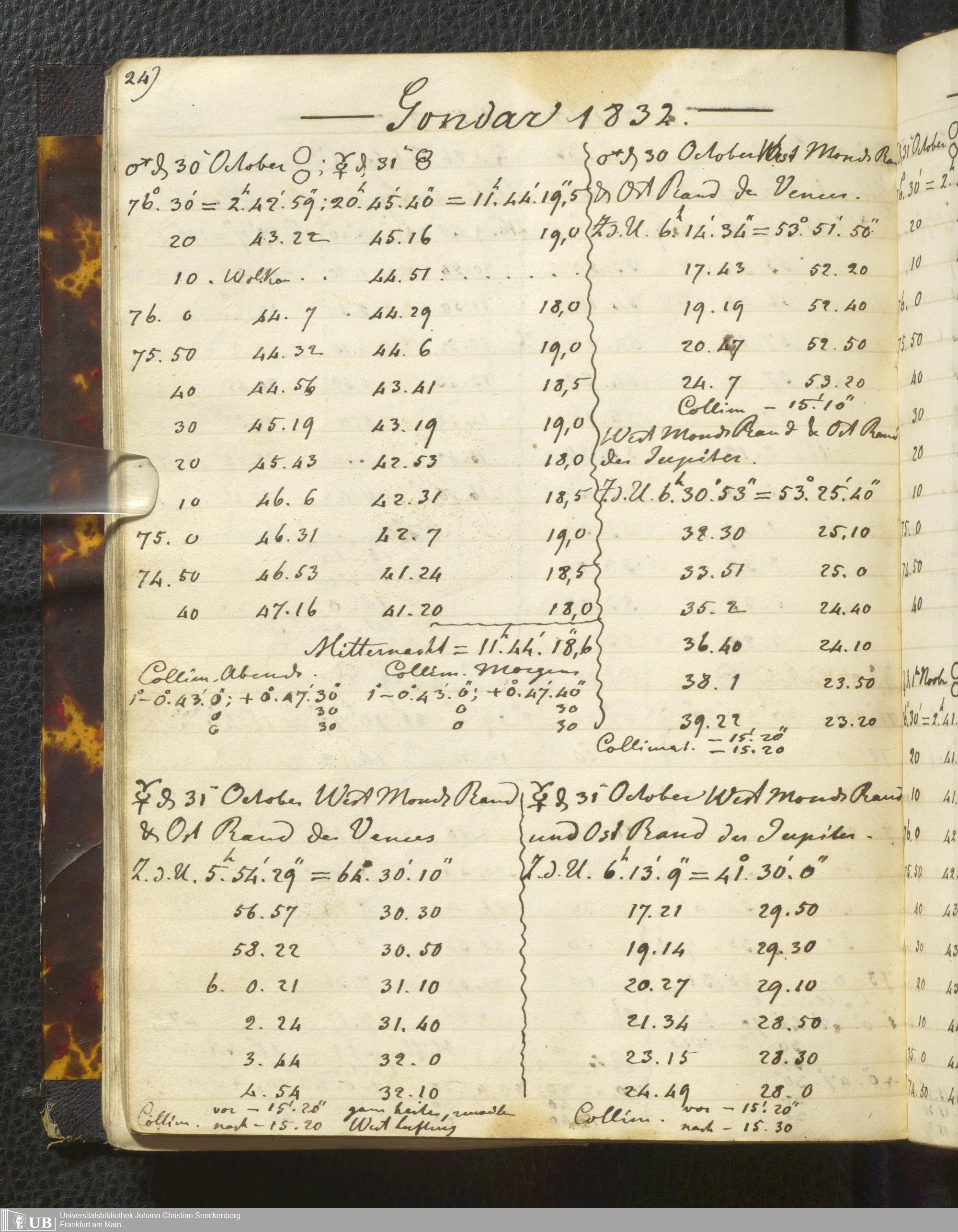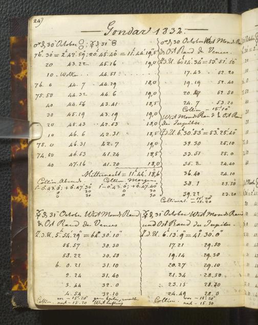 Ms. Ff. E. Rüppell I - Original Manuscript der auf meinen Reisen in Africa in den Jahren 1822 - 1827 gemachten astronomischen Beobachtungen. Sie sind sämmtlich theils in Zach's astronomischer Correspondenz, theils in dem Anhang zu meinen Reisen in Nubien pp. abgedruckt