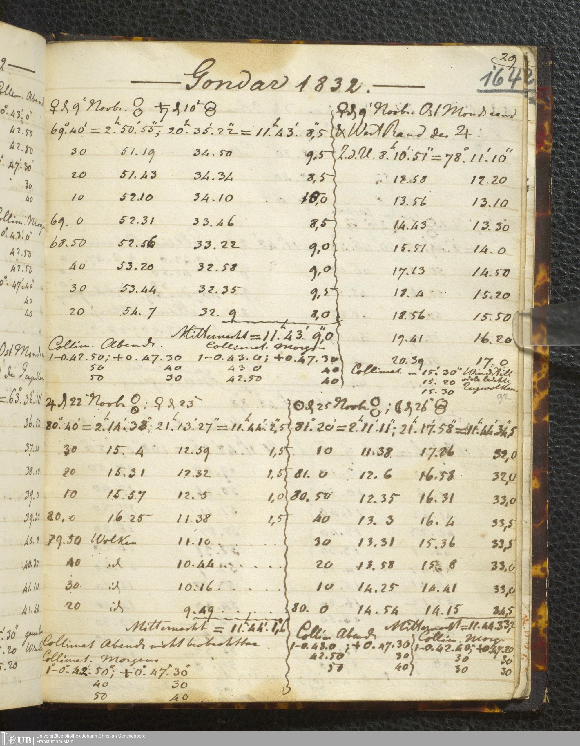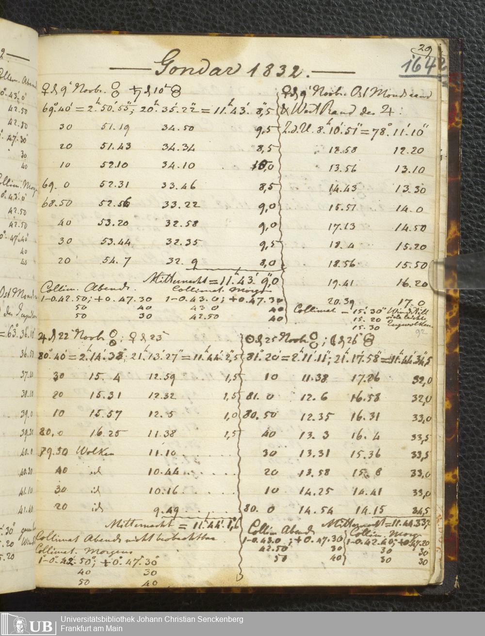 Ms. Ff. E. Rüppell I - Original Manuscript der auf meinen Reisen in Africa in den Jahren 1822 - 1827 gemachten astronomischen Beobachtungen. Sie sind sämmtlich theils in Zach's astronomischer Correspondenz, theils in dem Anhang zu meinen Reisen in Nubien pp. abgedruckt