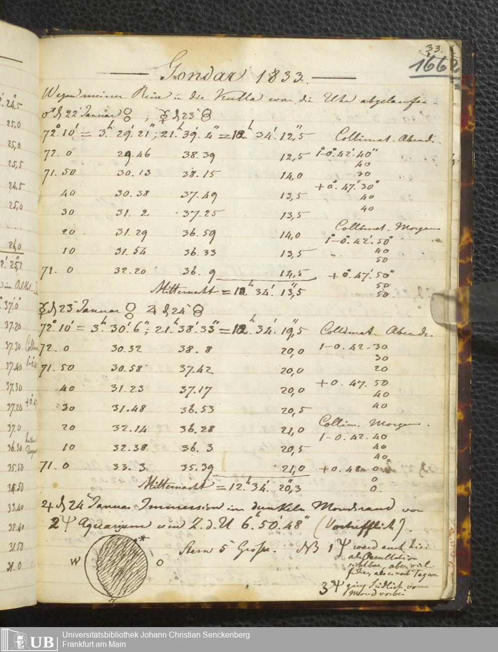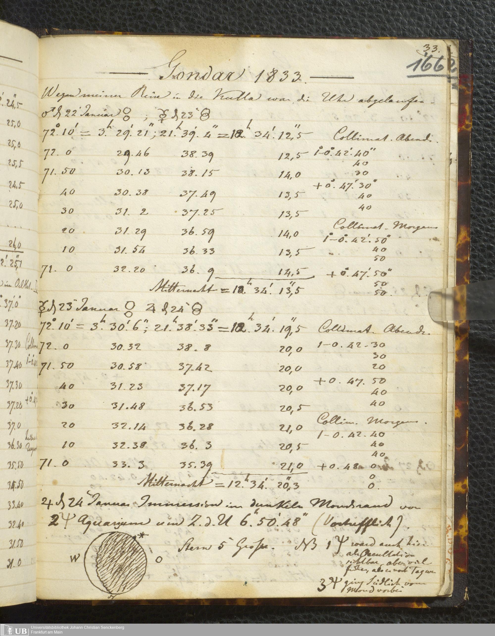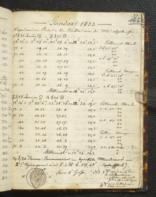 Ms. Ff. E. Rüppell I - Original Manuscript der auf meinen Reisen in Africa in den Jahren 1822 - 1827 gemachten astronomischen Beobachtungen. Sie sind sämmtlich theils in Zach's astronomischer Correspondenz, theils in dem Anhang zu meinen Reisen in Nubien pp. abgedruckt