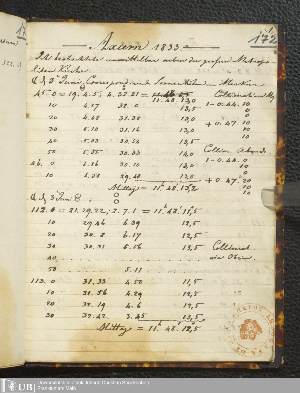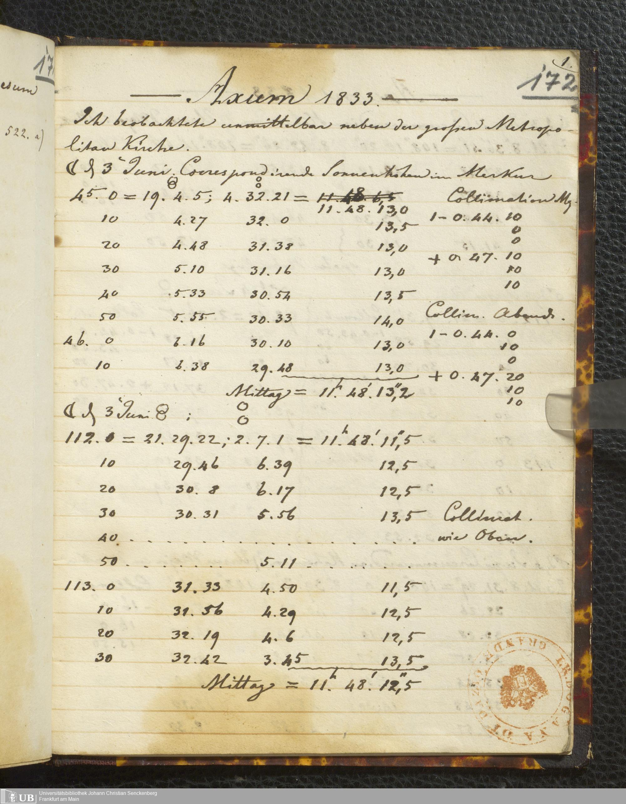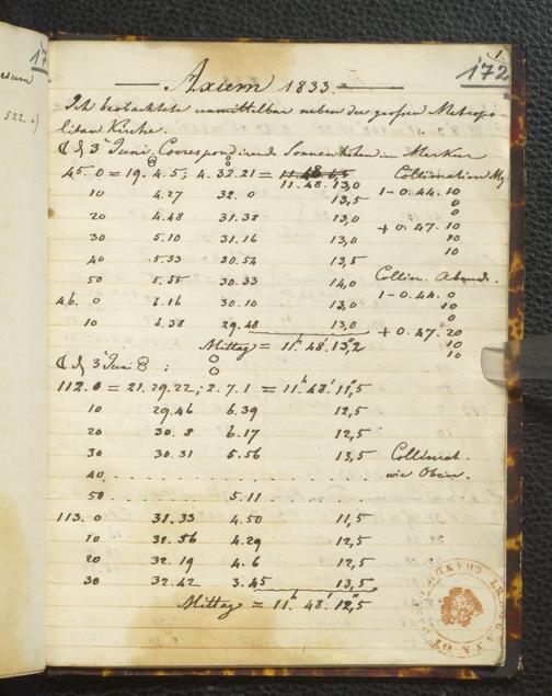 Ms. Ff. E. Rüppell I - Original Manuscript der auf meinen Reisen in Africa in den Jahren 1822 - 1827 gemachten astronomischen Beobachtungen. Sie sind sämmtlich theils in Zach's astronomischer Correspondenz, theils in dem Anhang zu meinen Reisen in Nubien pp. abgedruckt