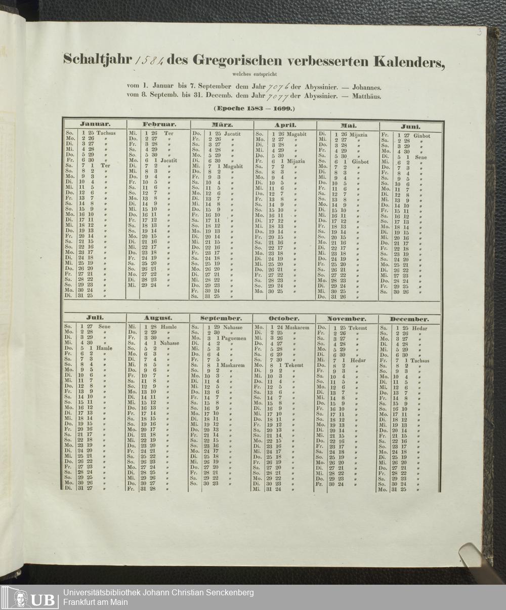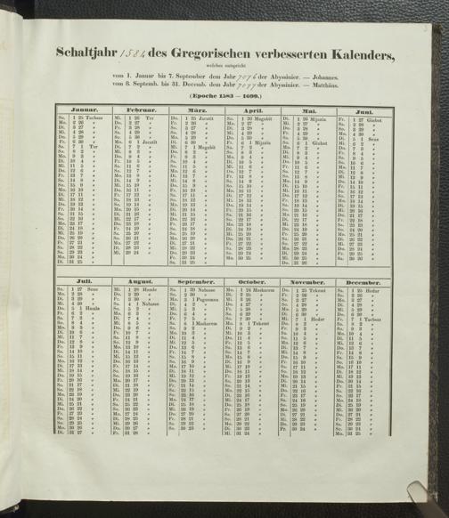 Ms. Ff. E. Rüppell IV - Kalender vom Jahr 1583 bis 1860, das heist seit der Einführung der durch Pabst Gregorius XIII verordneten Verbesserung, aus welchen Kalender die Gleichstellung dieser Zeitrechnung mit der von den Abyssiniern gebräuchlichen Chronologie ersehen werden kann; zum Behuf der geschichtlichen Forschungen der Abyssinischen Chroniken entworfen