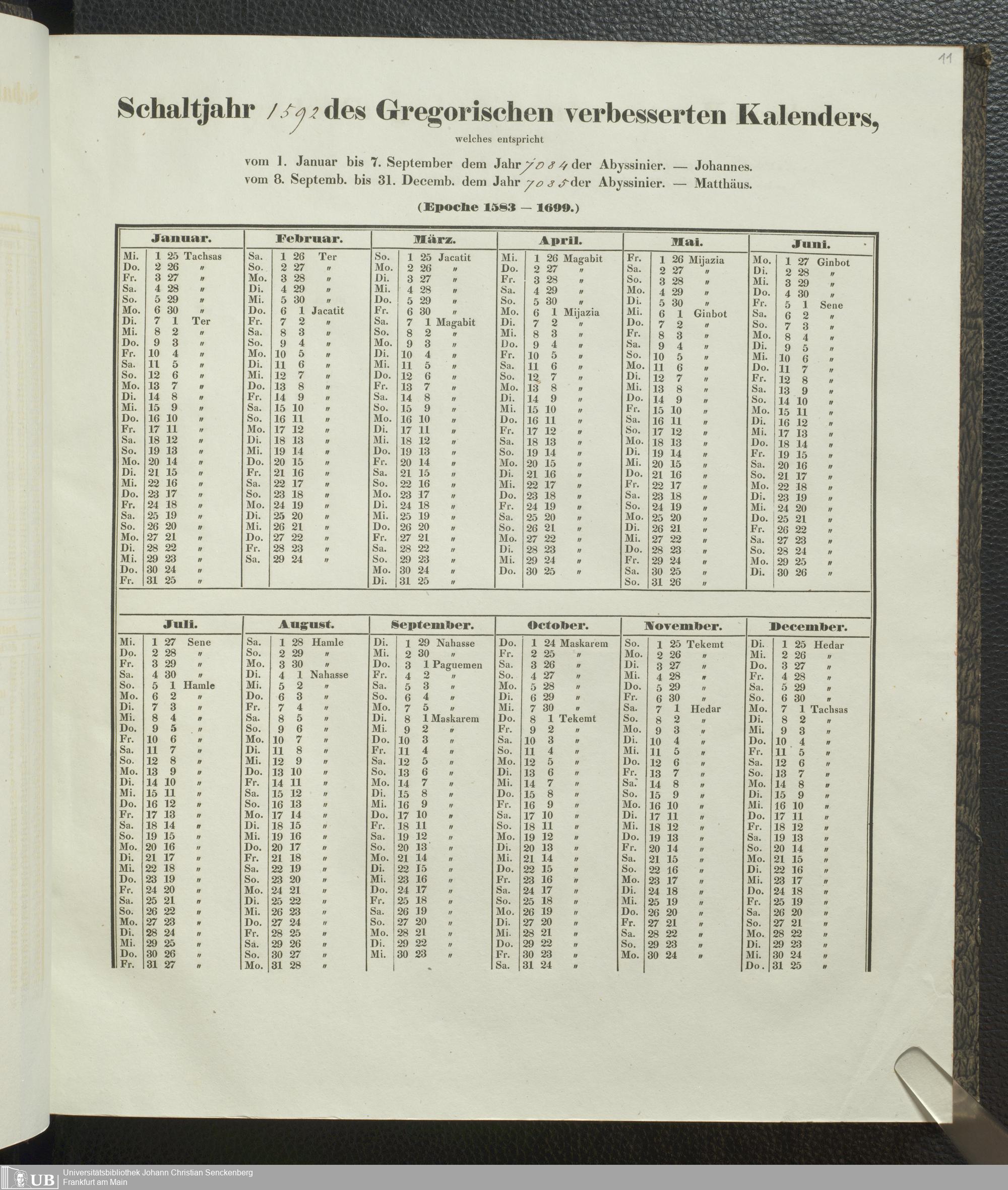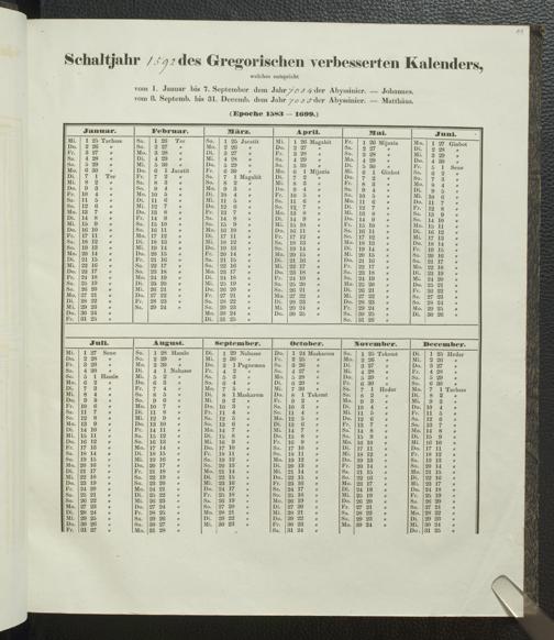 Ms. Ff. E. Rüppell IV - Kalender vom Jahr 1583 bis 1860, das heist seit der Einführung der durch Pabst Gregorius XIII verordneten Verbesserung, aus welchen Kalender die Gleichstellung dieser Zeitrechnung mit der von den Abyssiniern gebräuchlichen Chronologie ersehen werden kann; zum Behuf der geschichtlichen Forschungen der Abyssinischen Chroniken entworfen