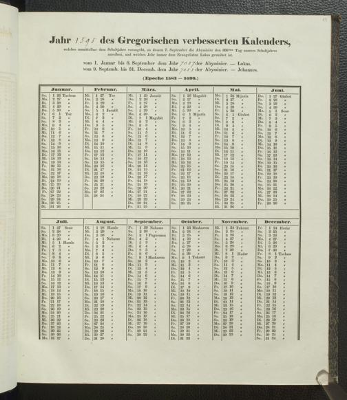Ms. Ff. E. Rüppell IV - Kalender vom Jahr 1583 bis 1860, das heist seit der Einführung der durch Pabst Gregorius XIII verordneten Verbesserung, aus welchen Kalender die Gleichstellung dieser Zeitrechnung mit der von den Abyssiniern gebräuchlichen Chronologie ersehen werden kann; zum Behuf der geschichtlichen Forschungen der Abyssinischen Chroniken entworfen