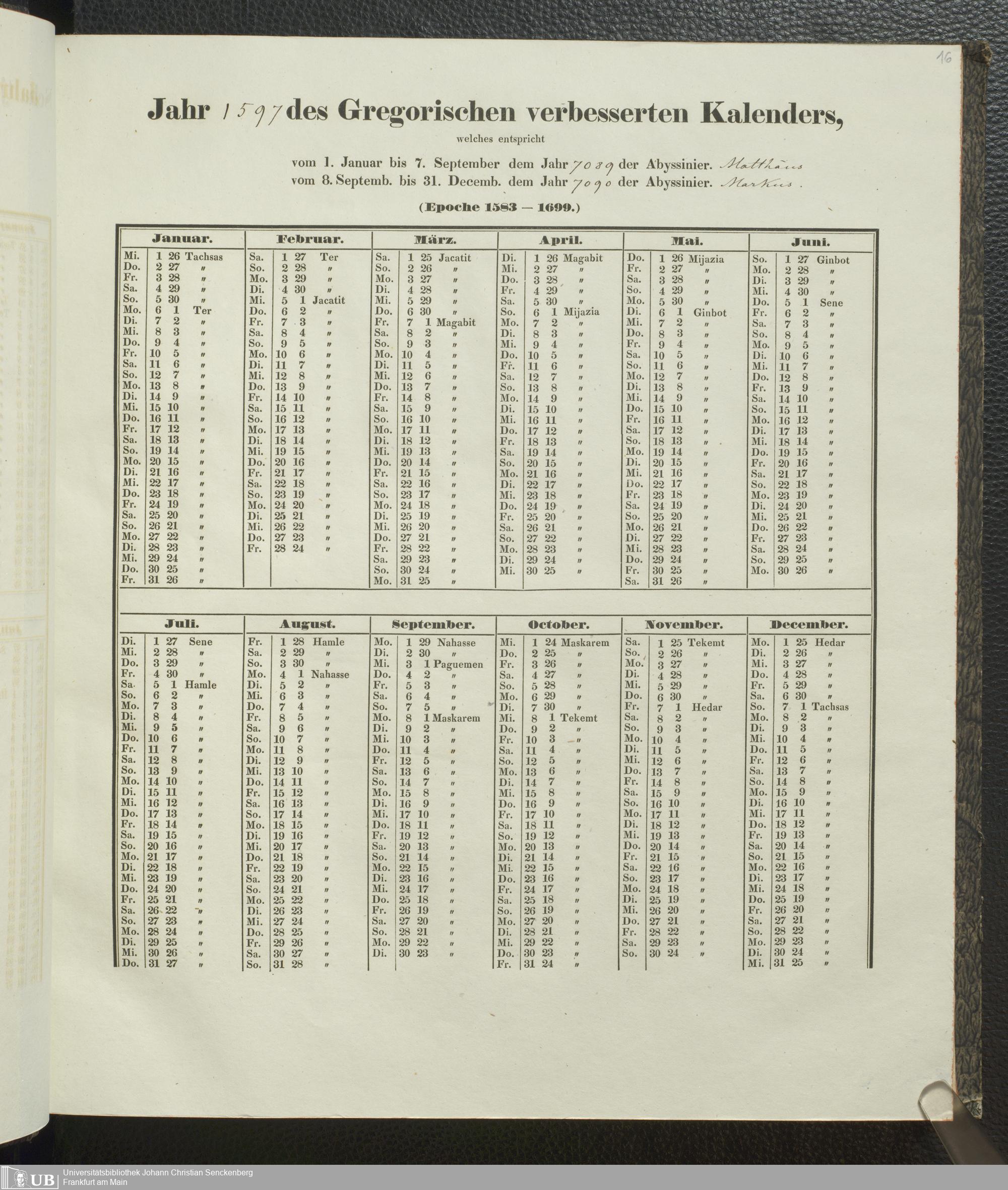 Ms. Ff. E. Rüppell IV - Kalender vom Jahr 1583 bis 1860, das heist seit der Einführung der durch Pabst Gregorius XIII verordneten Verbesserung, aus welchen Kalender die Gleichstellung dieser Zeitrechnung mit der von den Abyssiniern gebräuchlichen Chronologie ersehen werden kann; zum Behuf der geschichtlichen Forschungen der Abyssinischen Chroniken entworfen