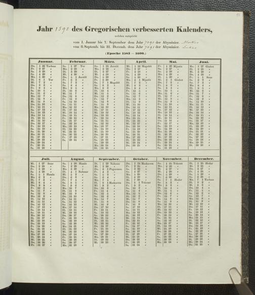 Ms. Ff. E. Rüppell IV - Kalender vom Jahr 1583 bis 1860, das heist seit der Einführung der durch Pabst Gregorius XIII verordneten Verbesserung, aus welchen Kalender die Gleichstellung dieser Zeitrechnung mit der von den Abyssiniern gebräuchlichen Chronologie ersehen werden kann; zum Behuf der geschichtlichen Forschungen der Abyssinischen Chroniken entworfen