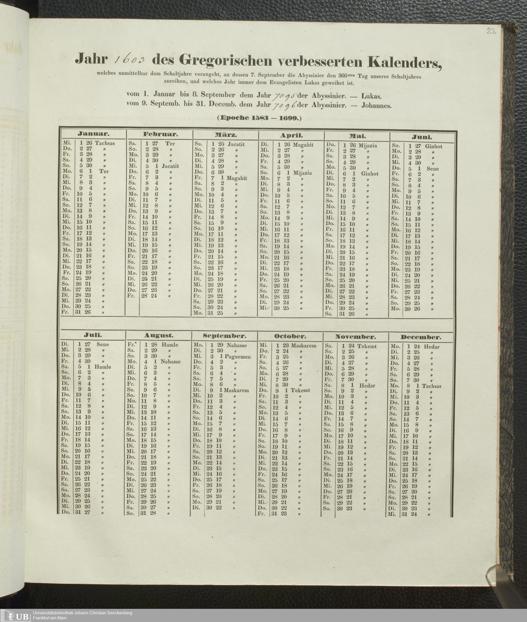 Ms. Ff. E. Rüppell IV - Kalender vom Jahr 1583 bis 1860, das heist seit der Einführung der durch Pabst Gregorius XIII verordneten Verbesserung, aus welchen Kalender die Gleichstellung dieser Zeitrechnung mit der von den Abyssiniern gebräuchlichen Chronologie ersehen werden kann; zum Behuf der geschichtlichen Forschungen der Abyssinischen Chroniken entworfen