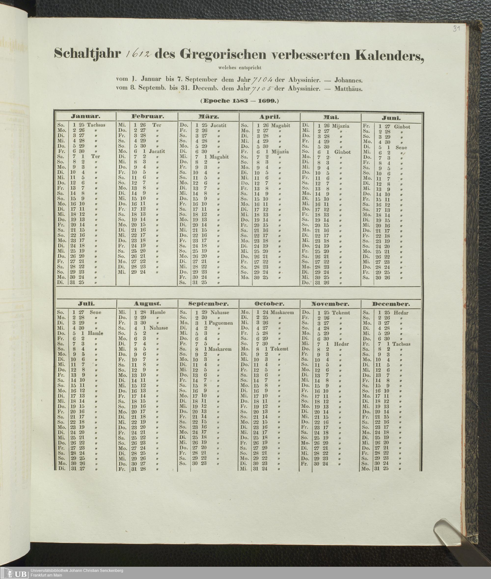 Ms. Ff. E. Rüppell IV - Kalender vom Jahr 1583 bis 1860, das heist seit der Einführung der durch Pabst Gregorius XIII verordneten Verbesserung, aus welchen Kalender die Gleichstellung dieser Zeitrechnung mit der von den Abyssiniern gebräuchlichen Chronologie ersehen werden kann; zum Behuf der geschichtlichen Forschungen der Abyssinischen Chroniken entworfen